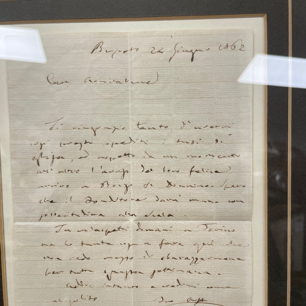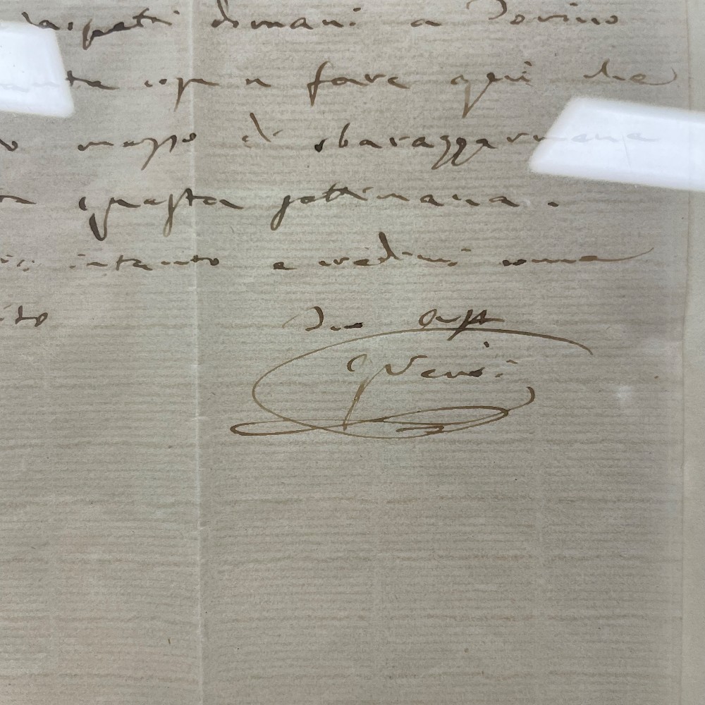 a letter to Count Arrivebene, making arrangements to meet in the Turine next day, dated at Bussetto June, 24, 1862framed, h. 16", w. 13"