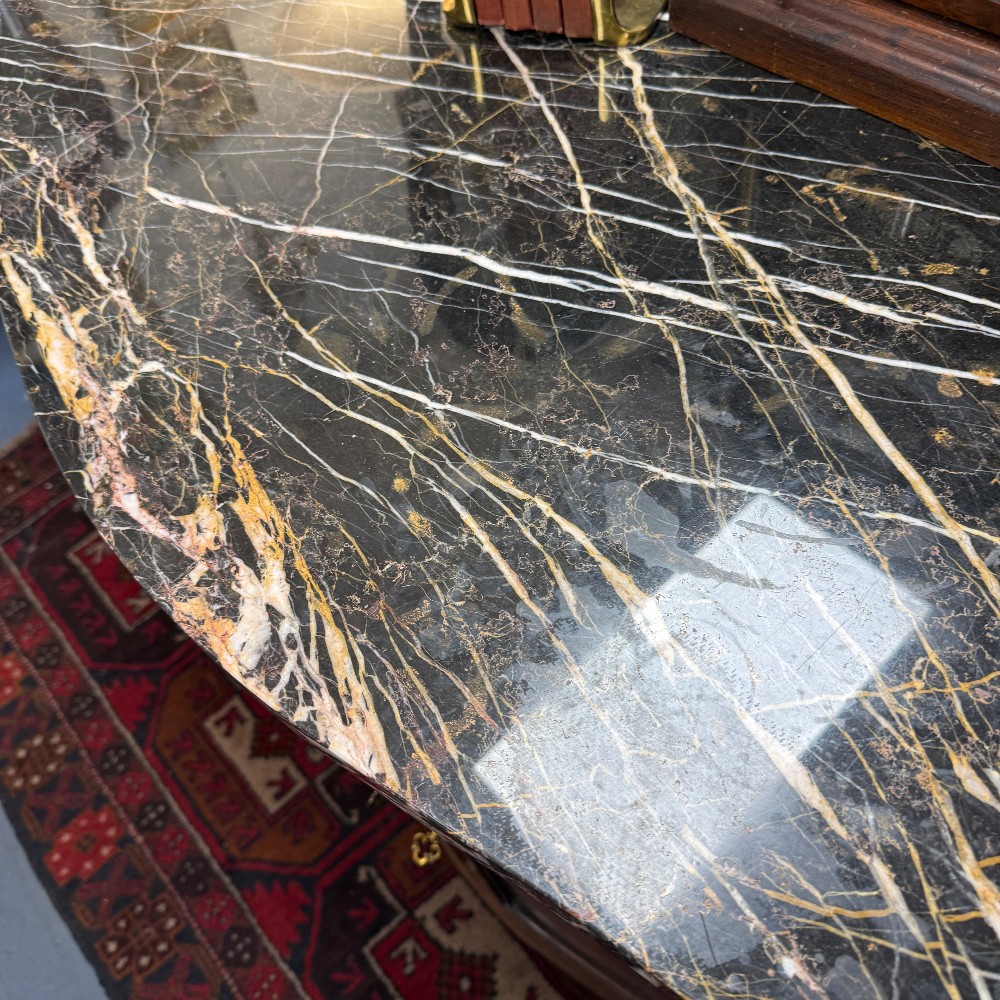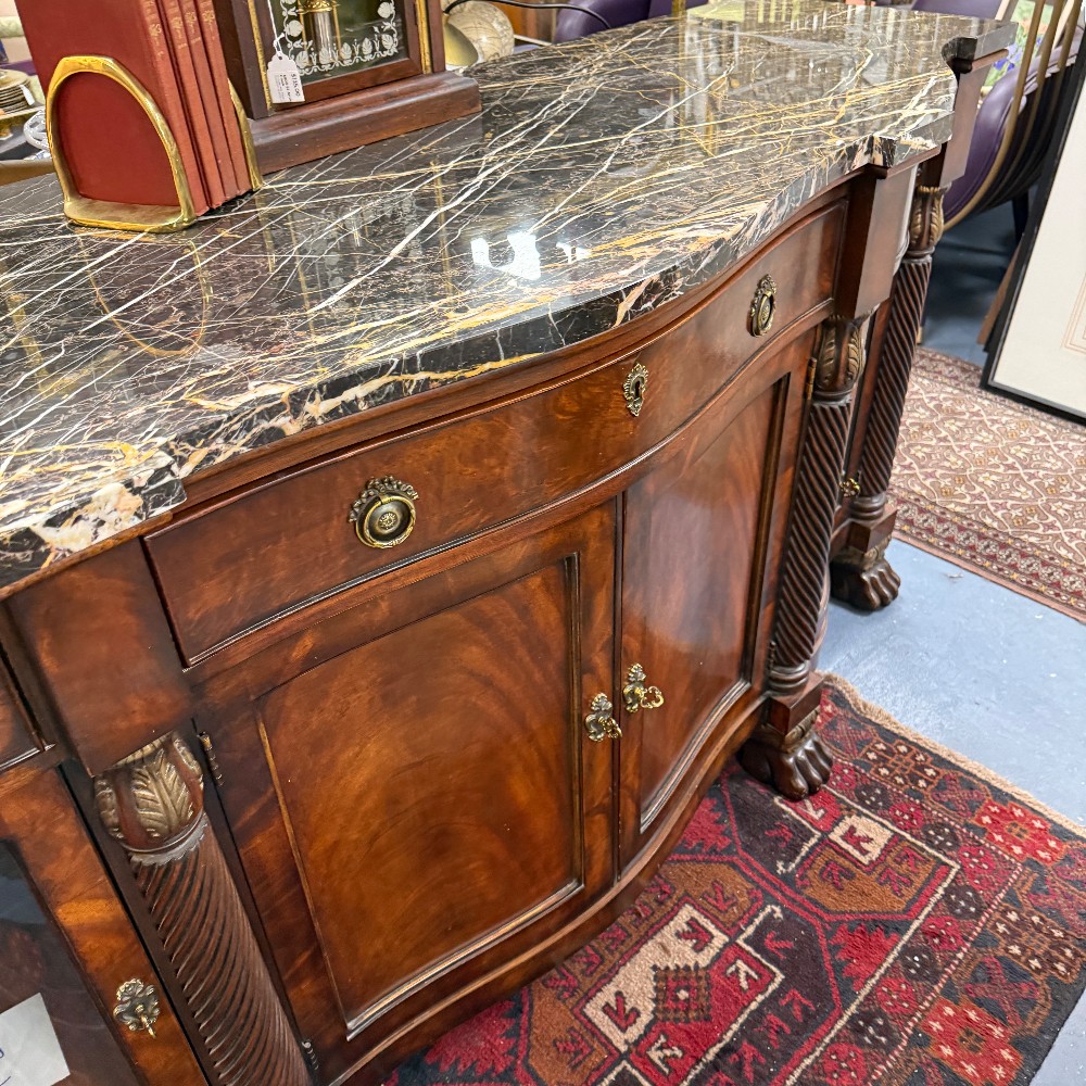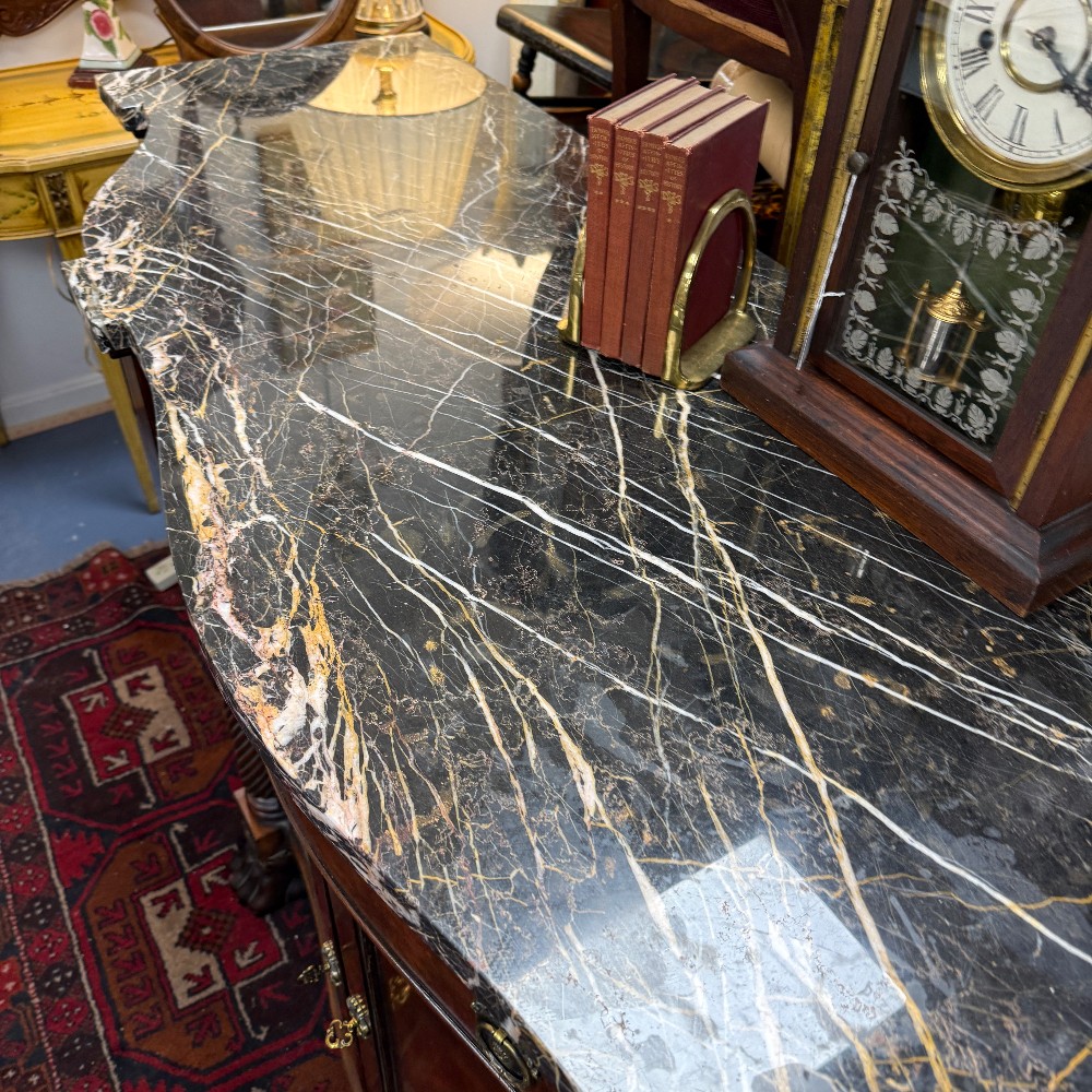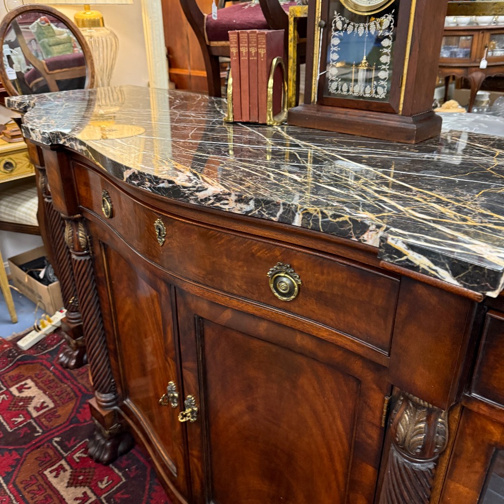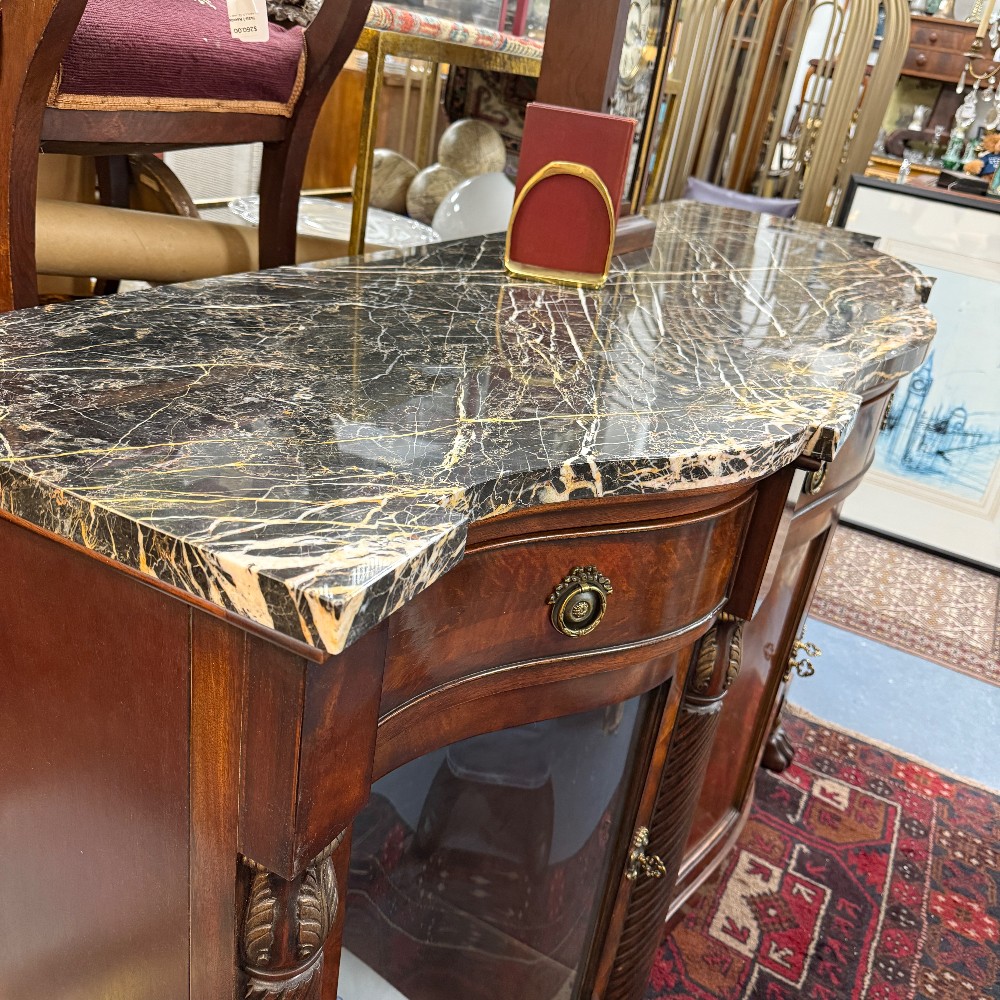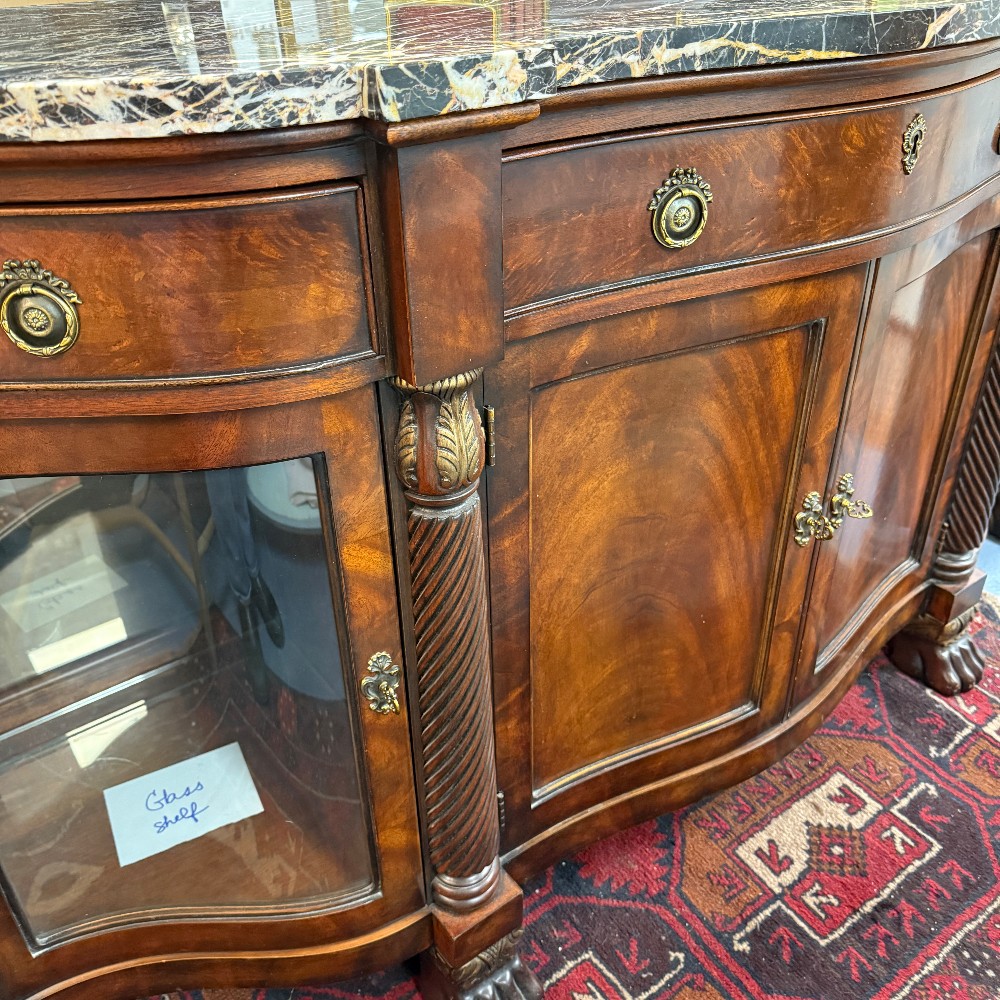 38.5" tall, 24.5" deep 76.5" wide (curvy top, 24.5 is longest depth) paw feet, glass shelves & light