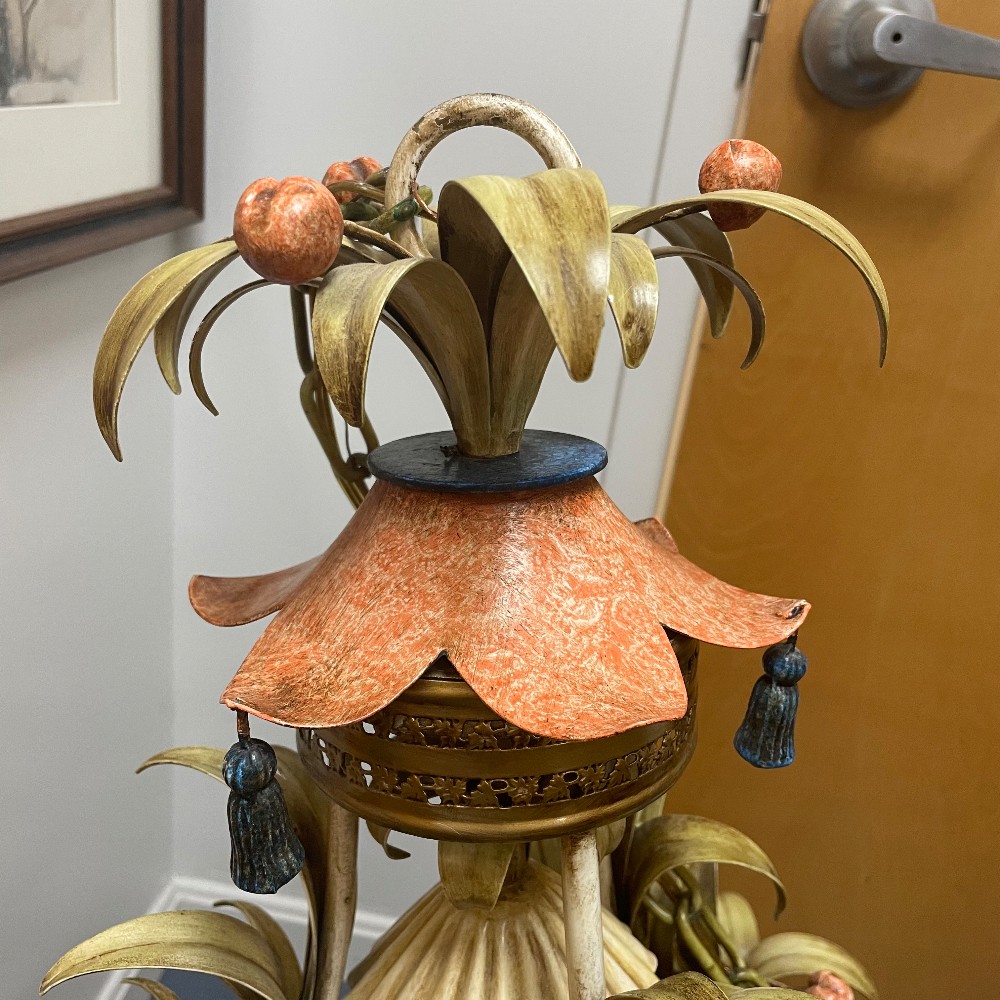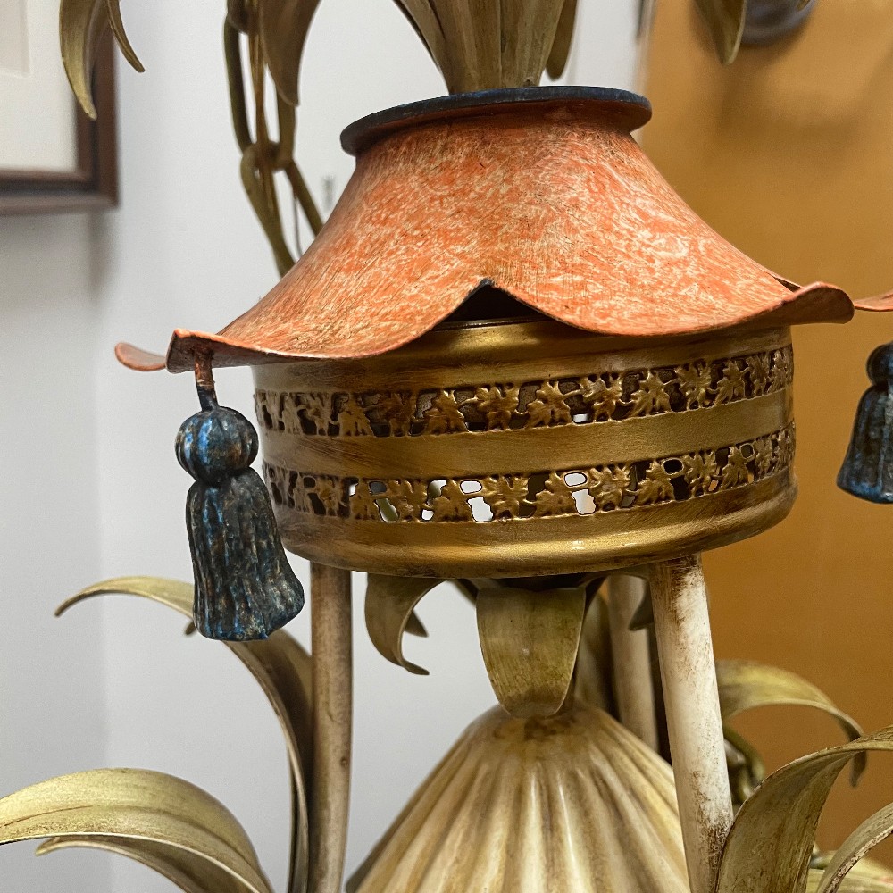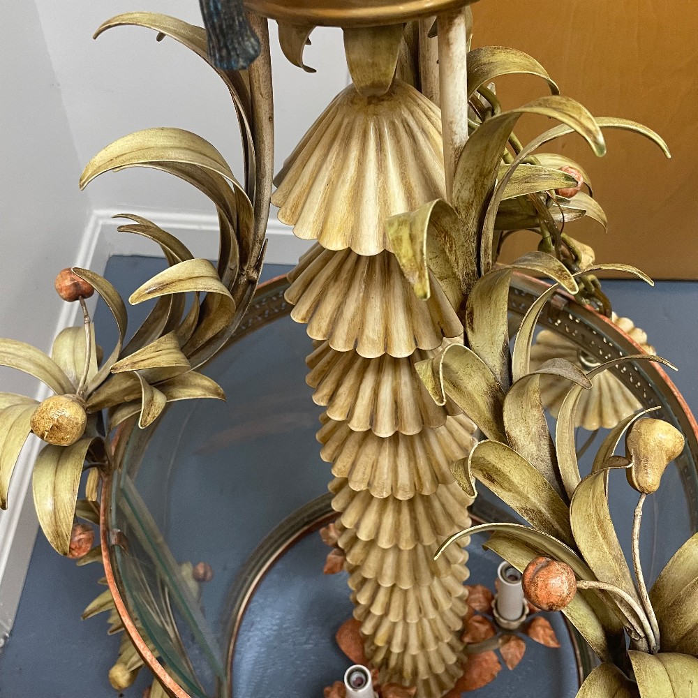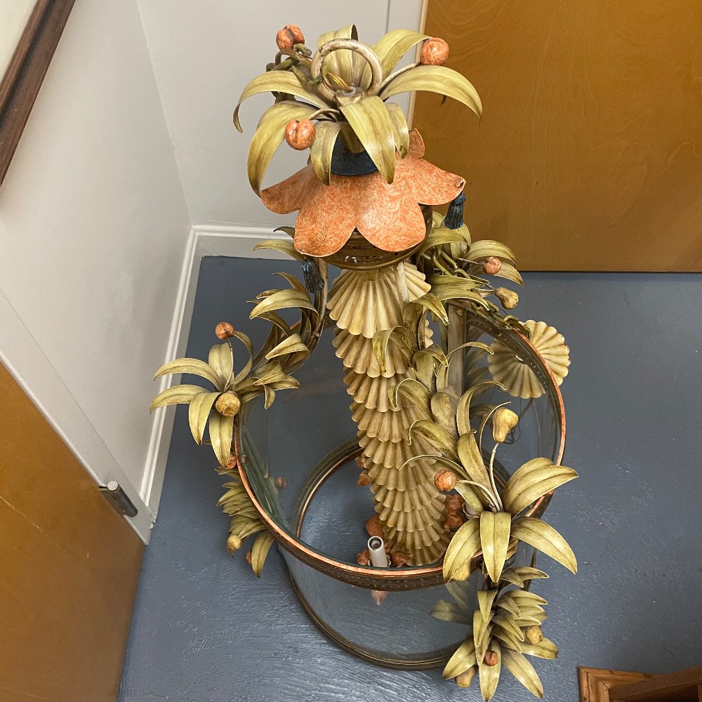 Stunning vintage, hand-painted & gilt tole metal and glass chandelier. Measuring 23"D 38"T. Chain 31" long. Excellent condition. As pictured.