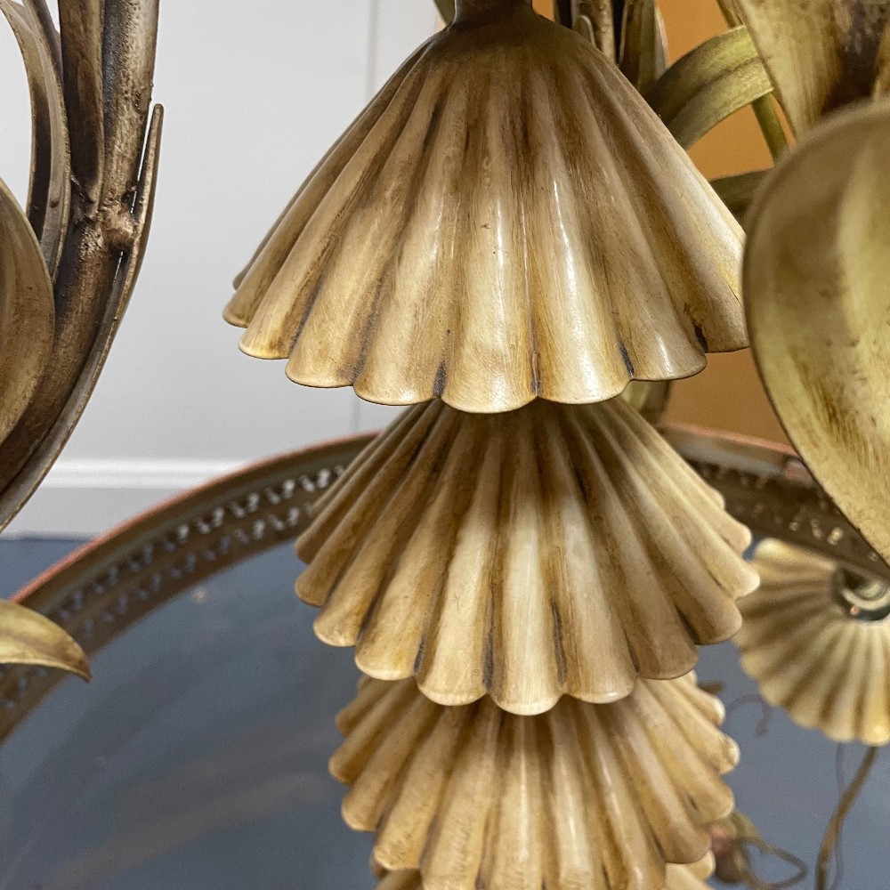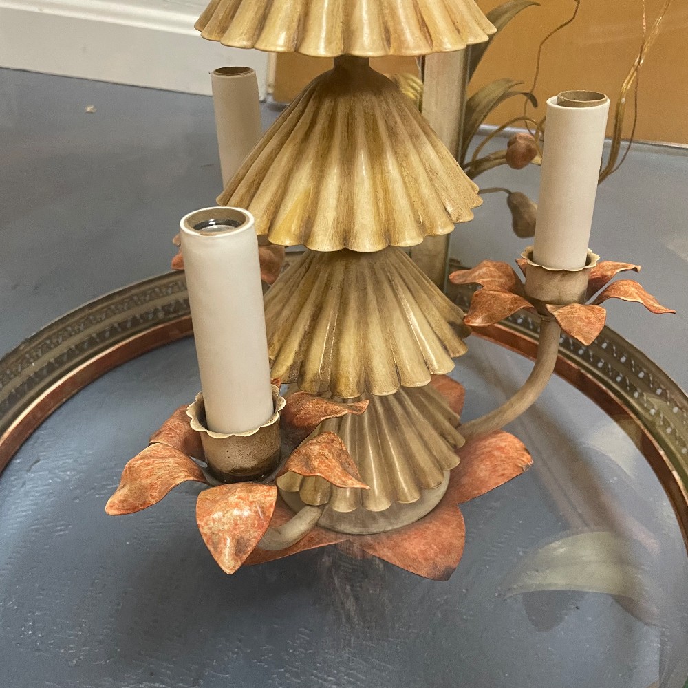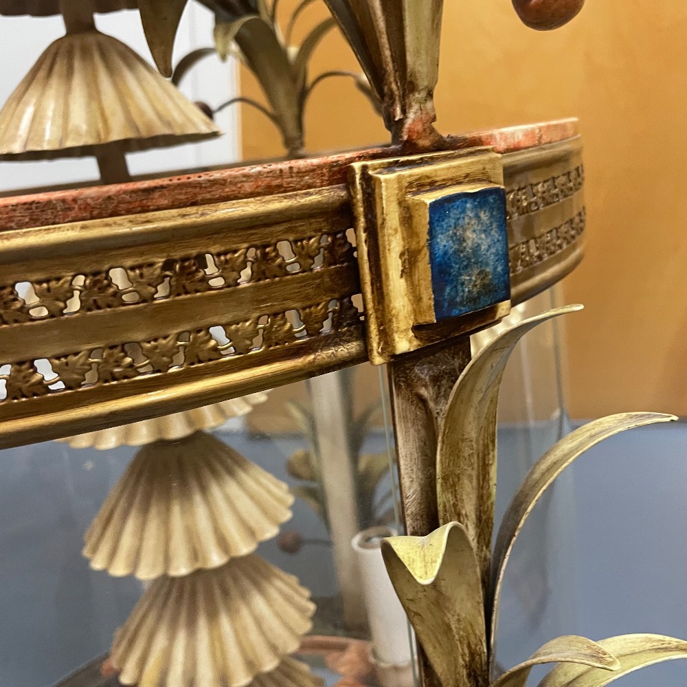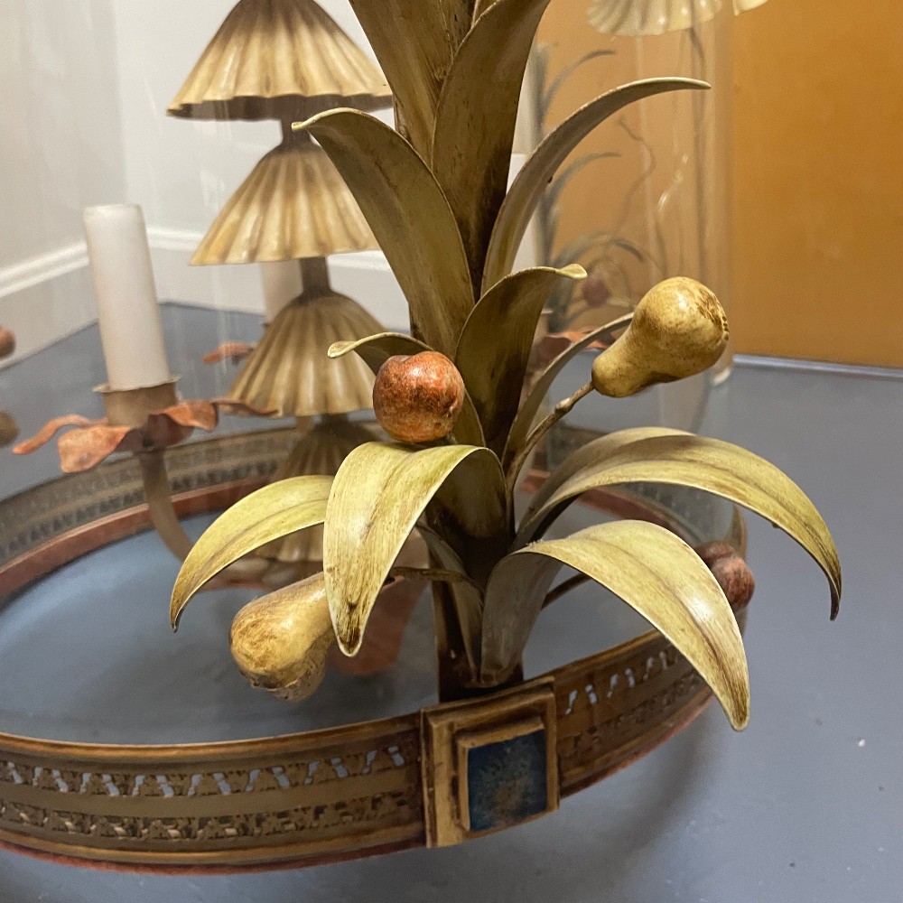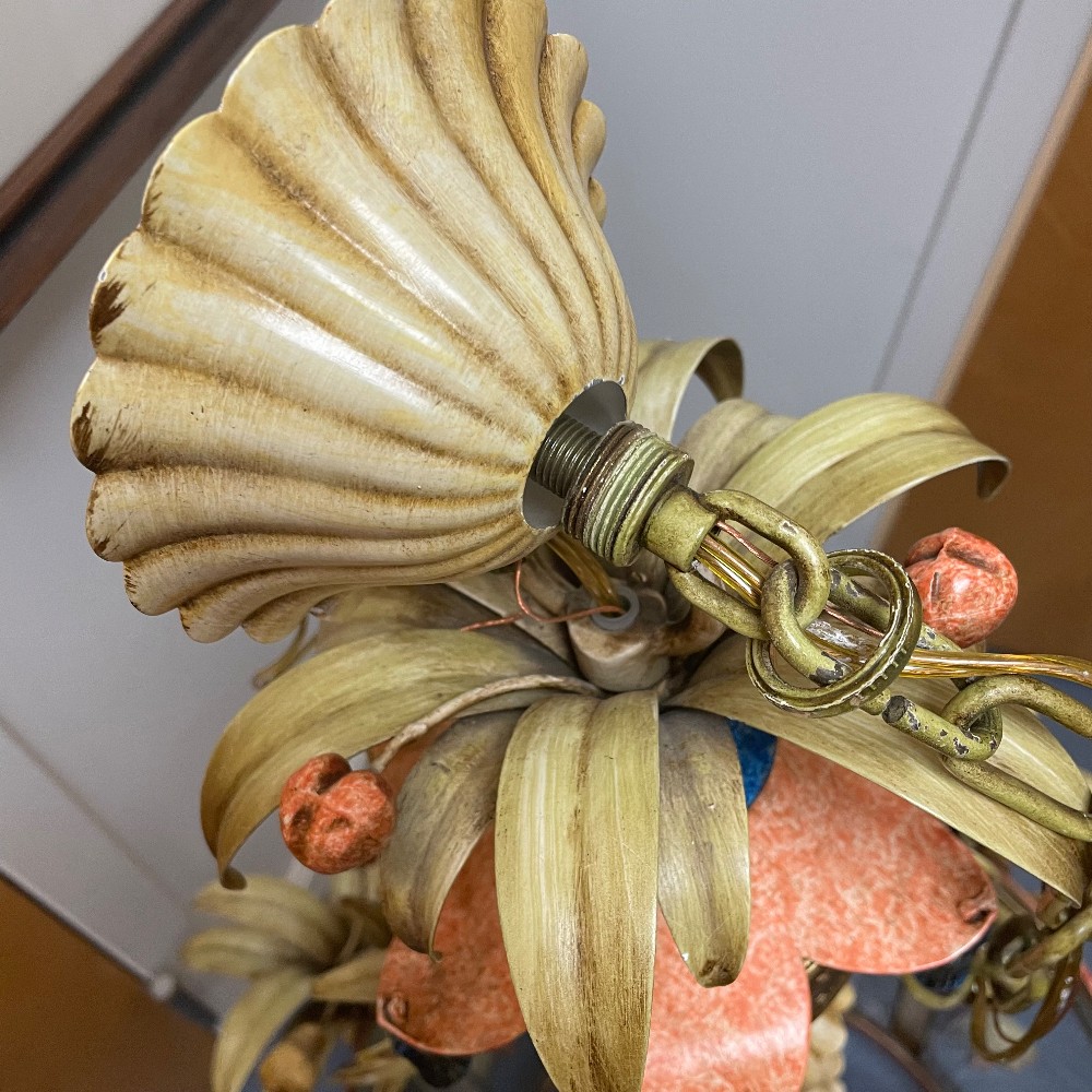 Stunning vintage, hand-painted & gilt tole metal and glass chandelier. Measuring 23"D 38"T. Chain 31" long. Excellent condition. As pictured.