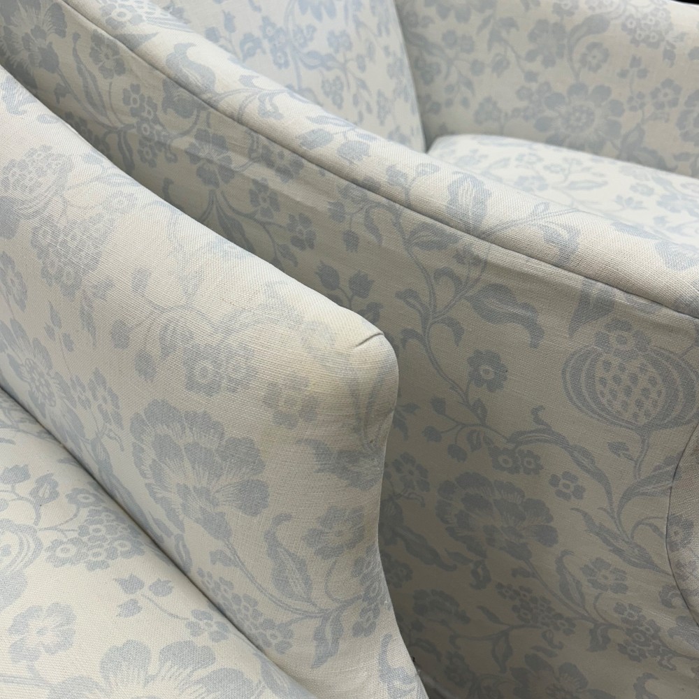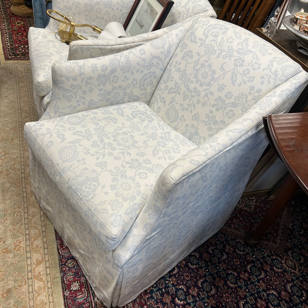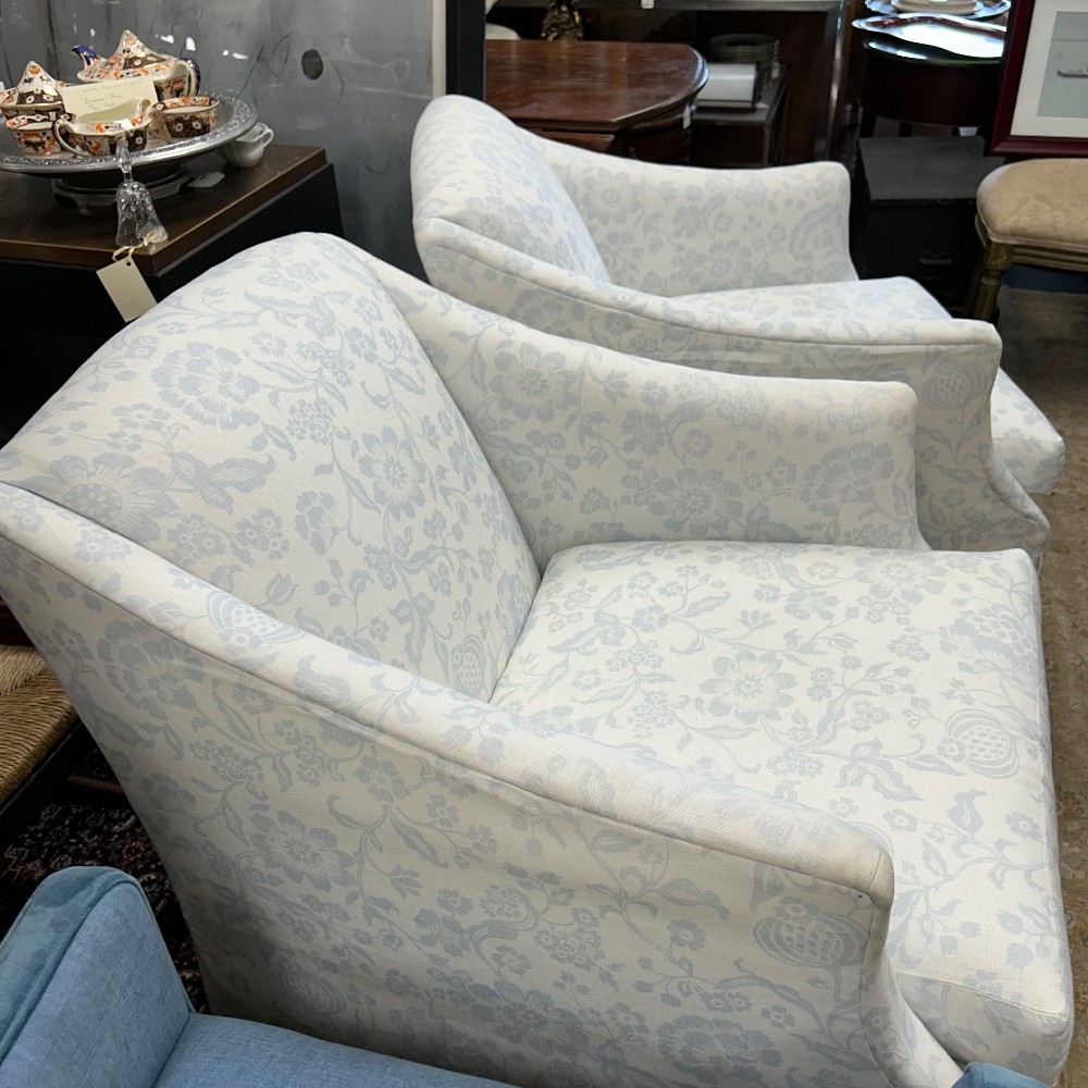 Pair of chairs. Slight discoloration on arms, as pictured. Soft blue and white floral pattern. Measuring 29"W x 34"T x 34"D x 19" seat height