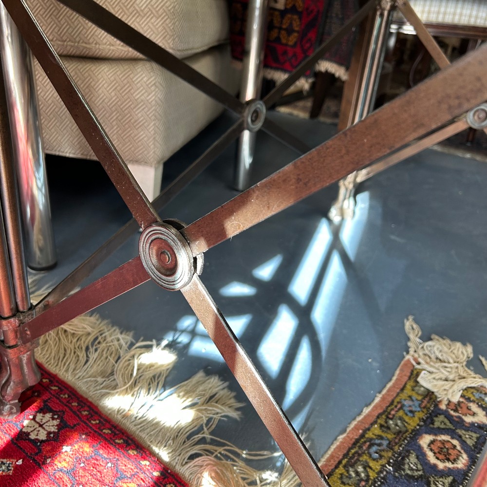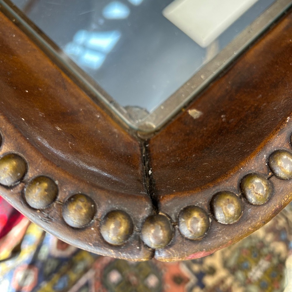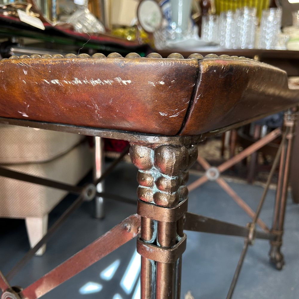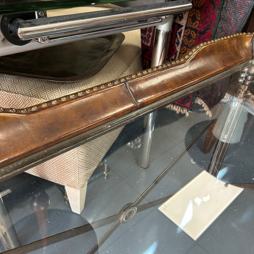 leather and glass top, bronze finished base, h. 25", w. 37 3/4", d. 23 1/2"