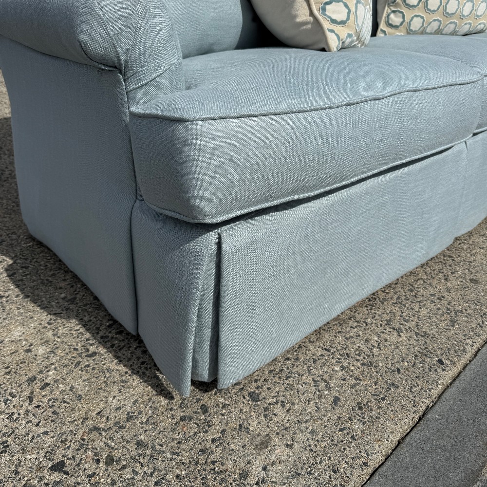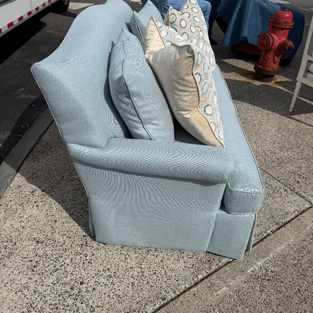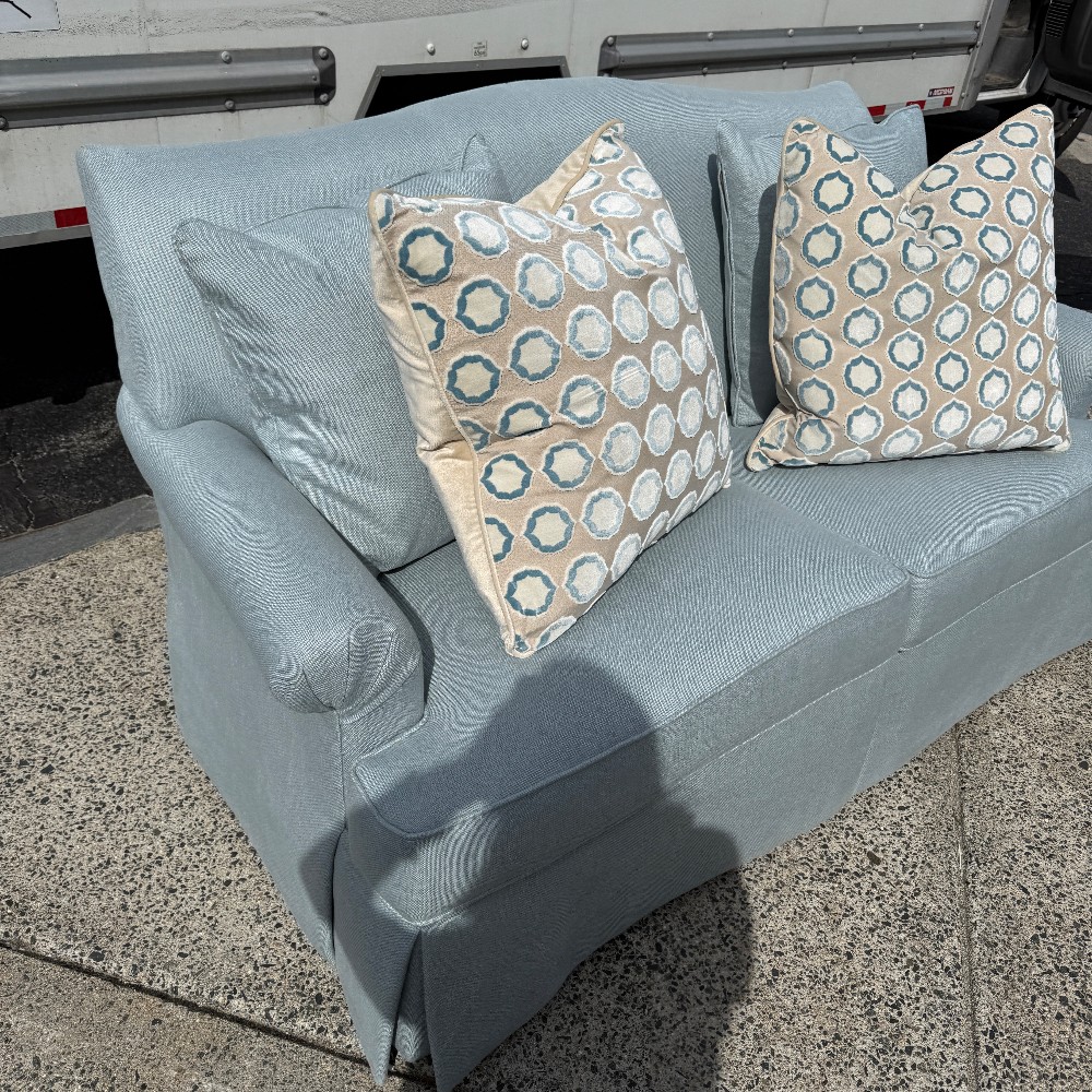 63" l x 31" d x 34.5" H and 21.5" Seat Depth and 17" seat height - two throw down pillows, down and foam seat