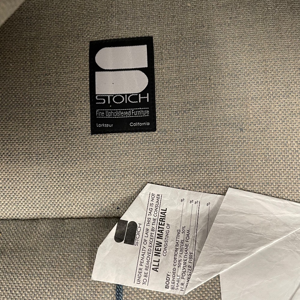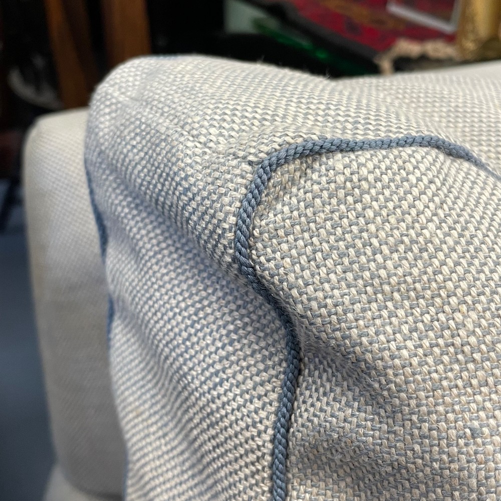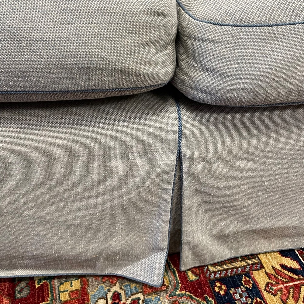 light gray with blue/gray piping, h. 30" (without pillow), seat h. 18 1/2", w. 72"