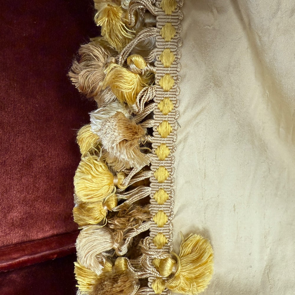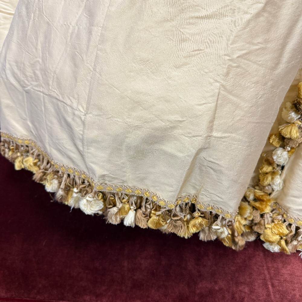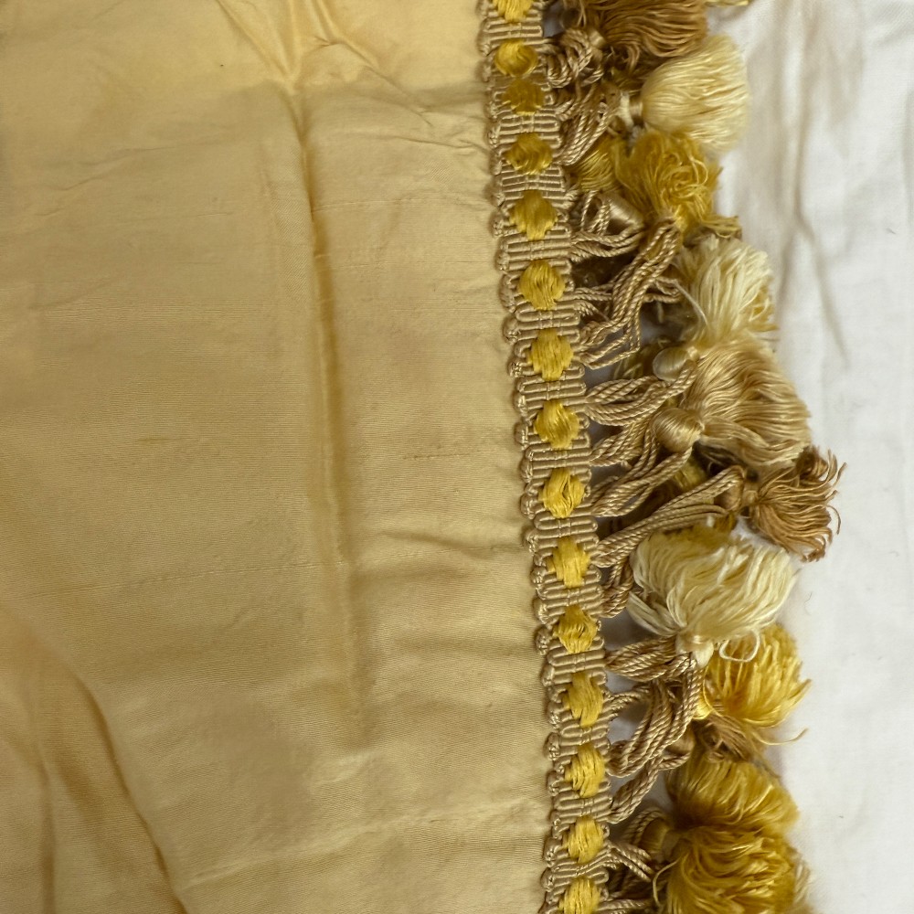 crushed silk, pleated top 49" wide, with soft velvet fringe 86" tall - weights on bottom, well made lined black out soft yellow