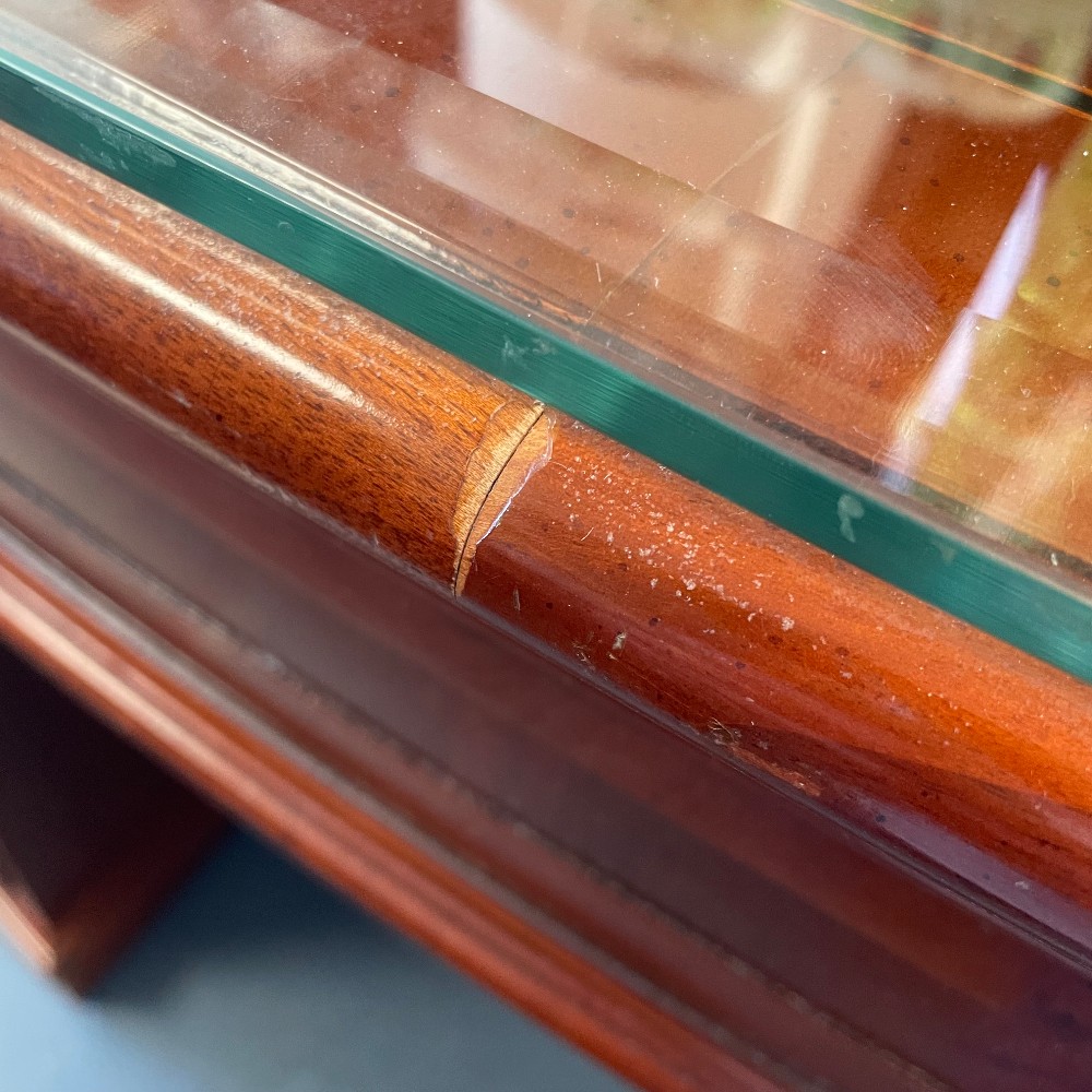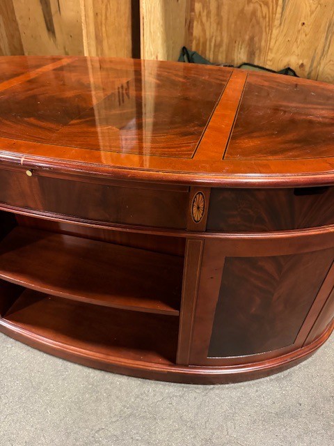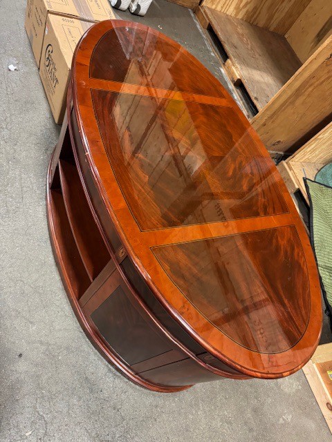 with glass top, h. 30 1/2", d. 36", w. 64'