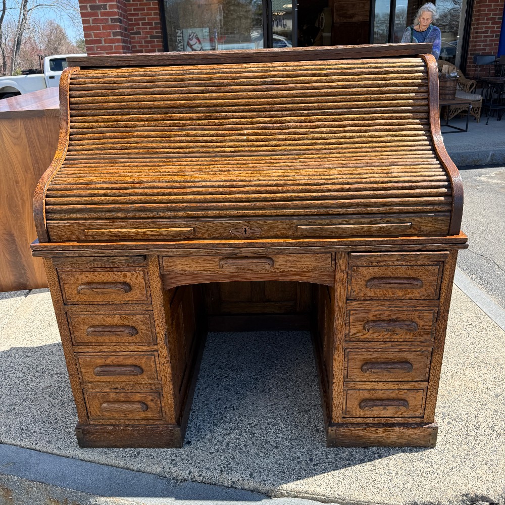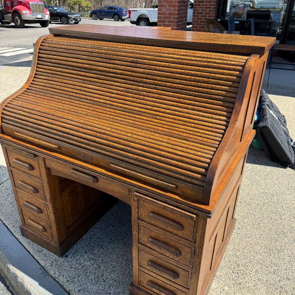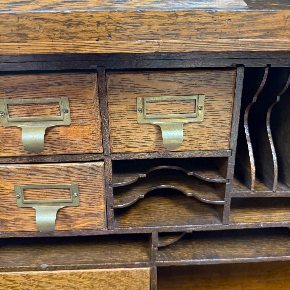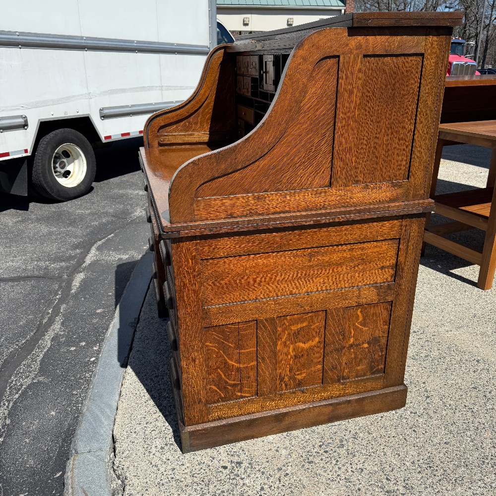 with 7 drawers, 31.5" deep, 48.5" wide, 49.5" tall back, 30" tall desk (knee hole is 20.5" x 24")