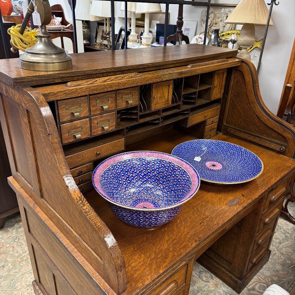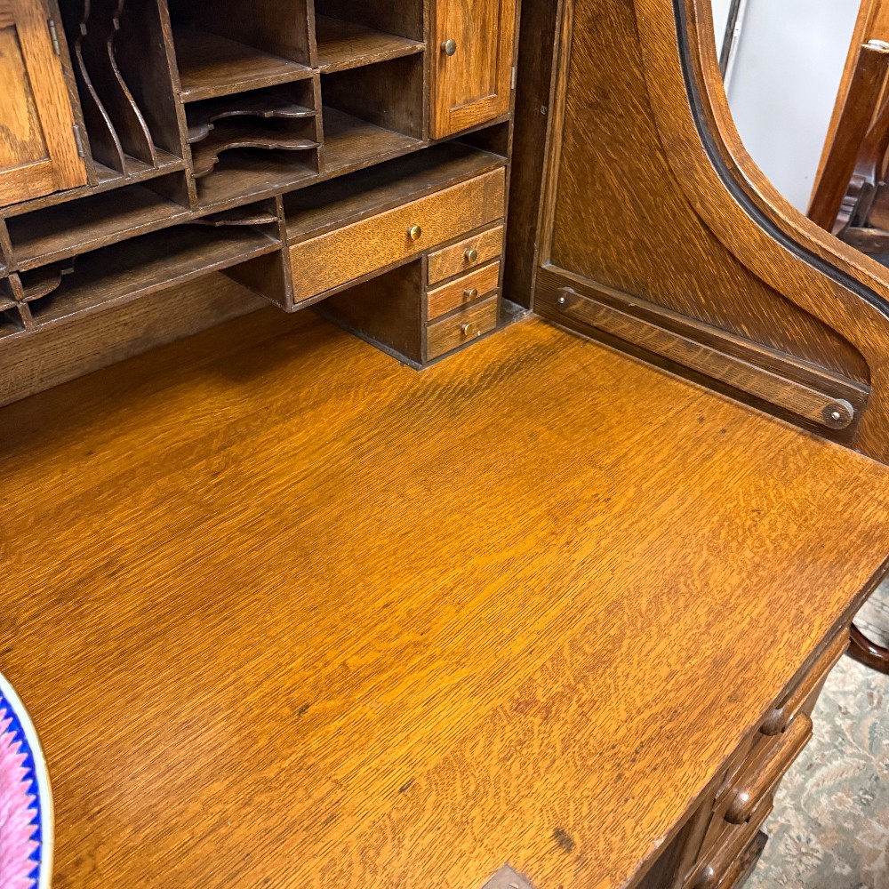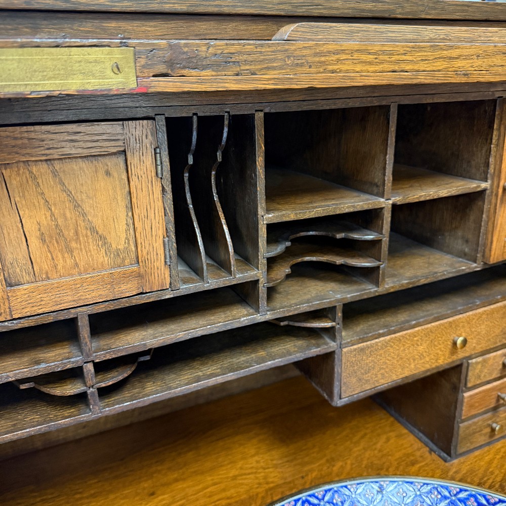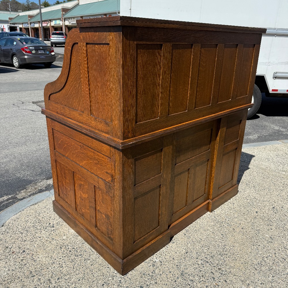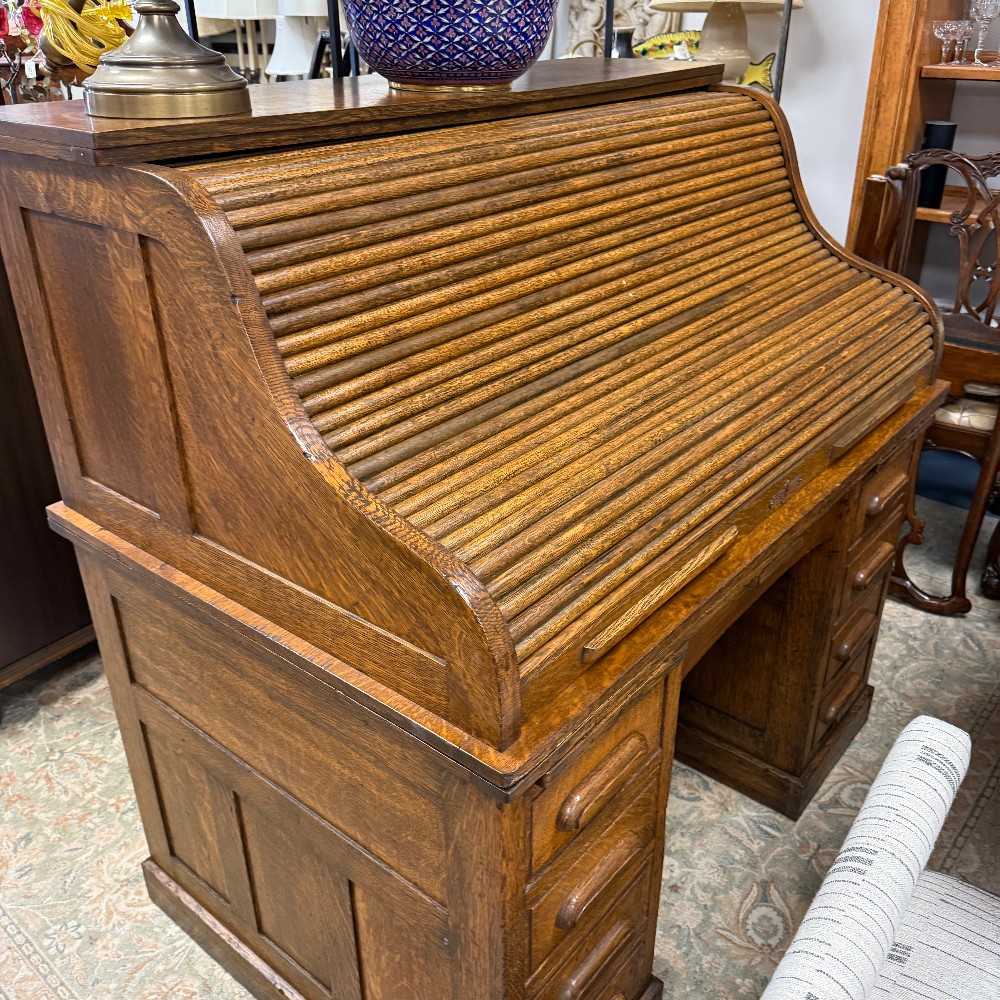 with 7 drawers, 31.5" deep, 48.5" wide, 49.5" tall back, 30" tall desk (knee hole is 20.5" x 24")