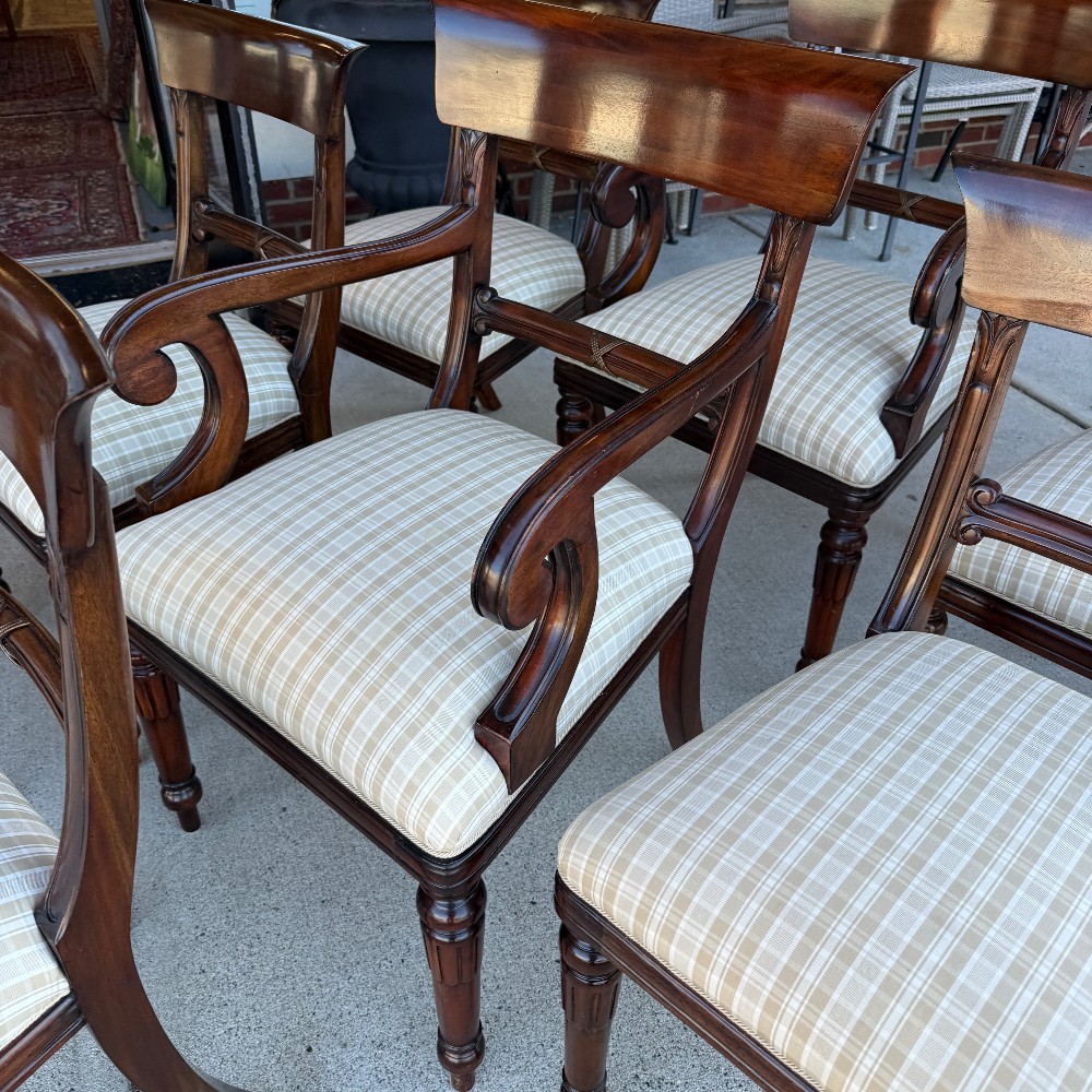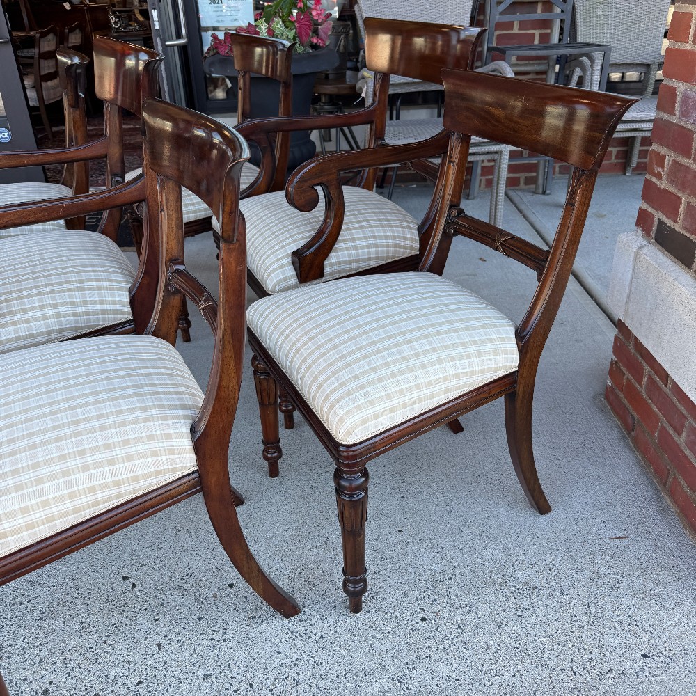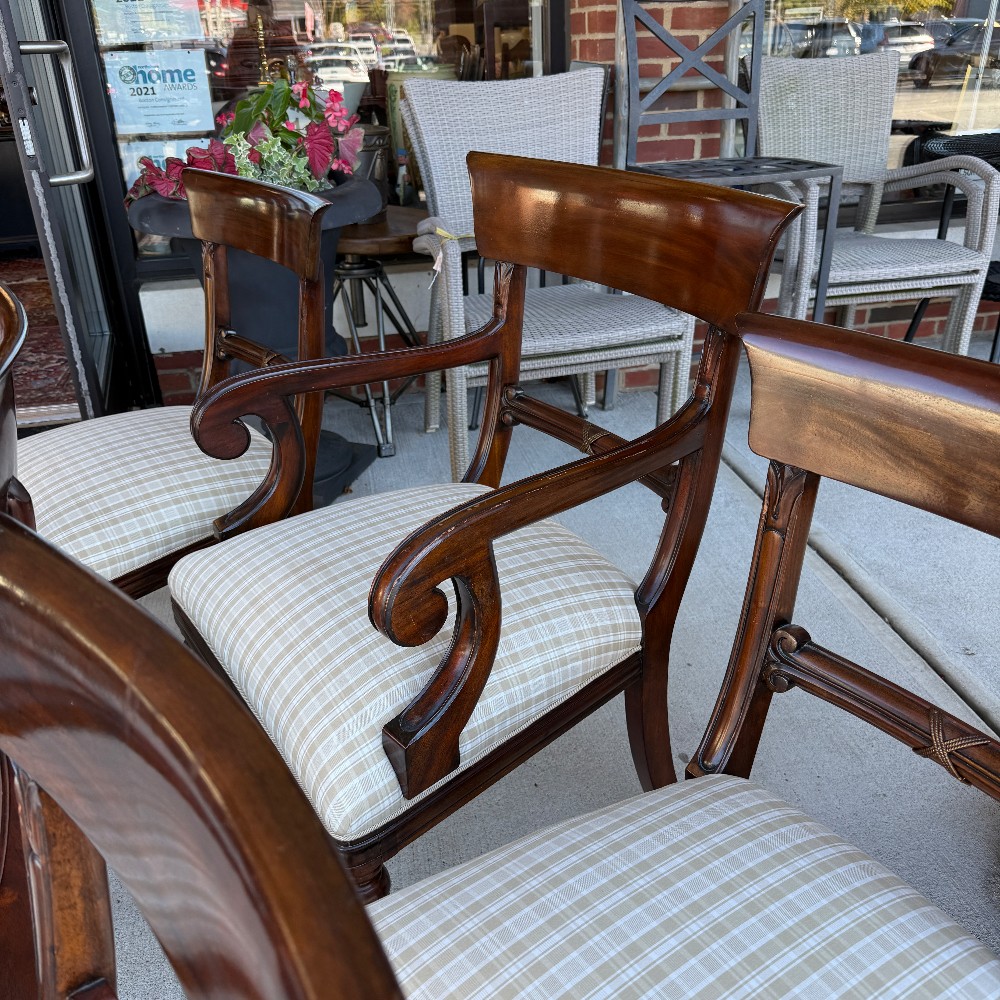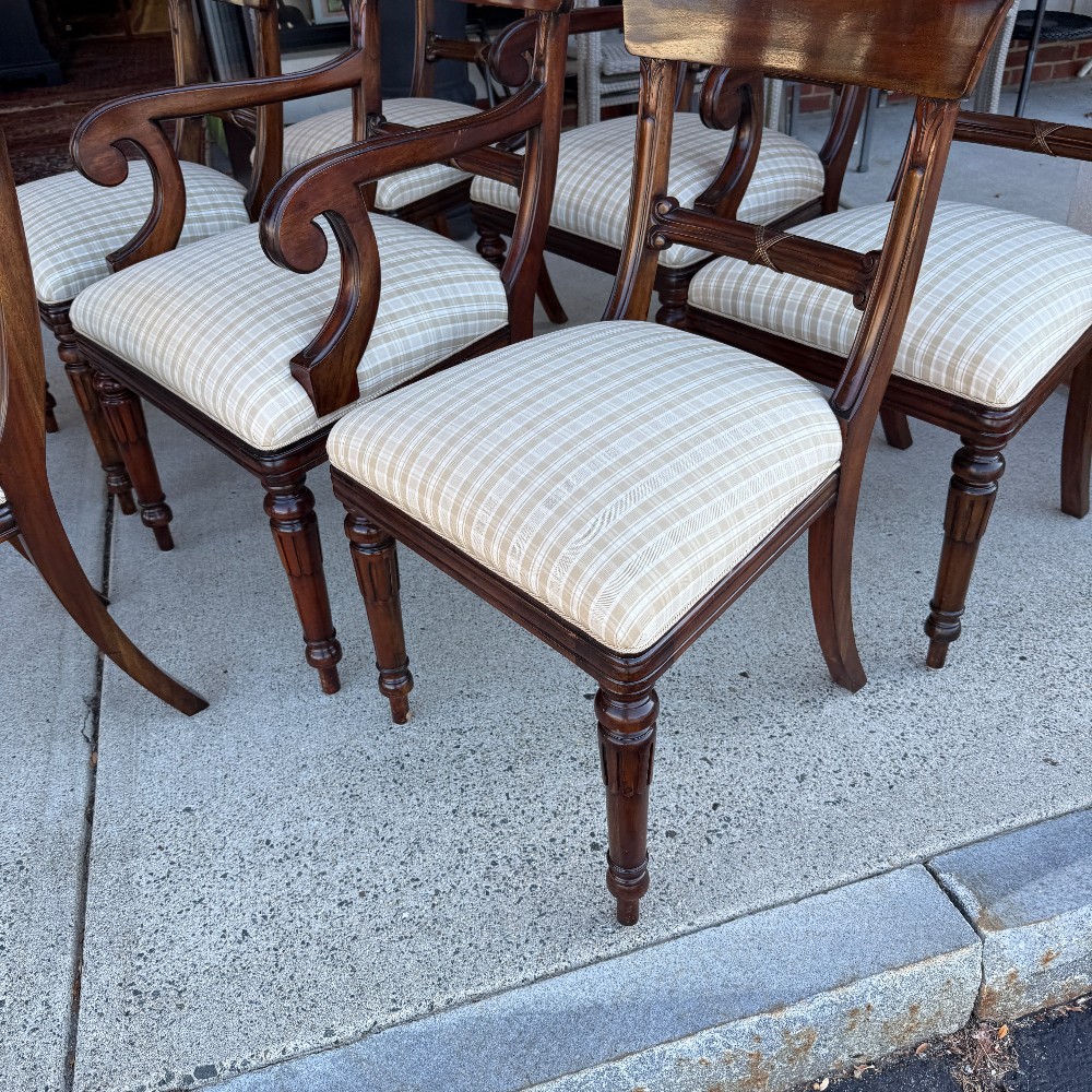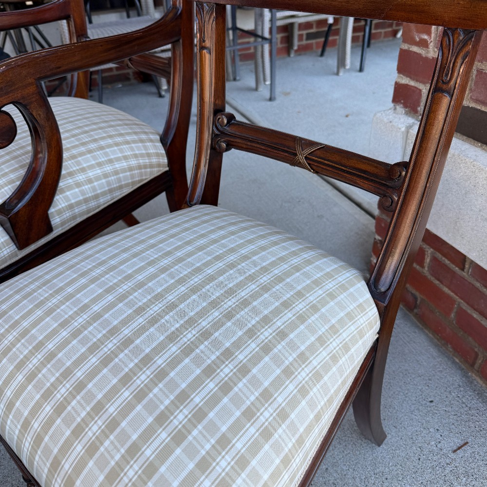 two with arms, 22" w, 23" d, 37" tall and 6 without arms, 20" seat h, 34.5" tall, 22 " wide 23" deep - reupholstered Scalamandre silk check