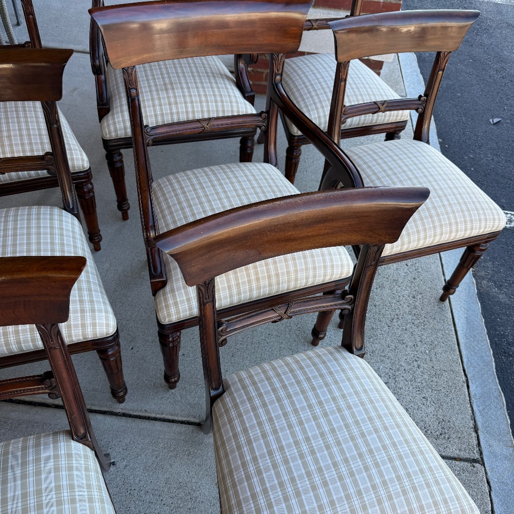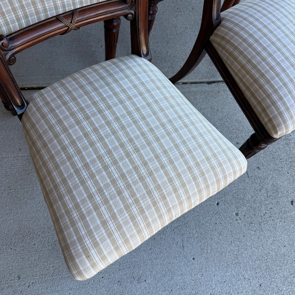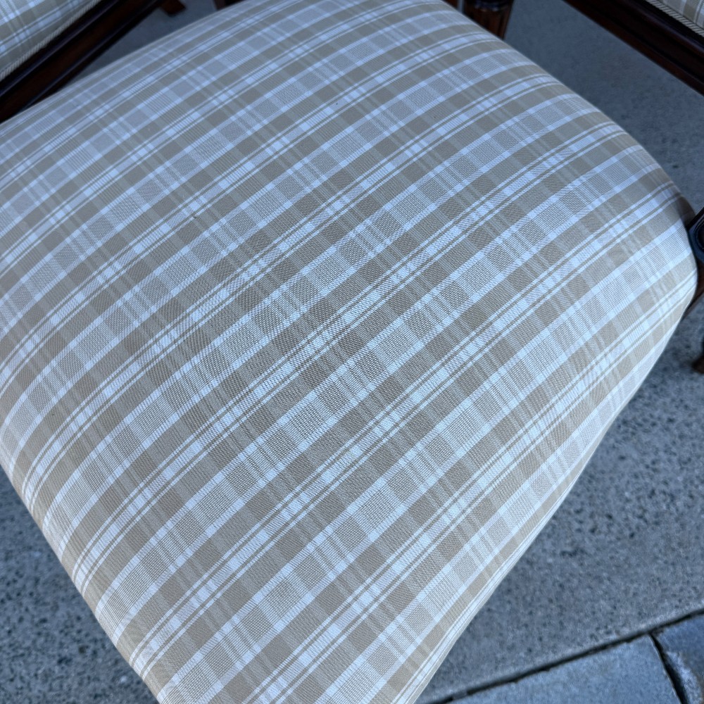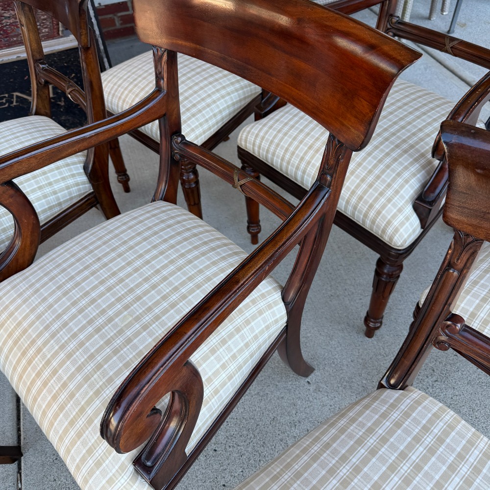 two with arms, 22" w, 23" d, 37" tall and 6 without arms, 20" seat h, 34.5" tall, 22 " wide 23" deep - reupholstered Scalamandre silk check