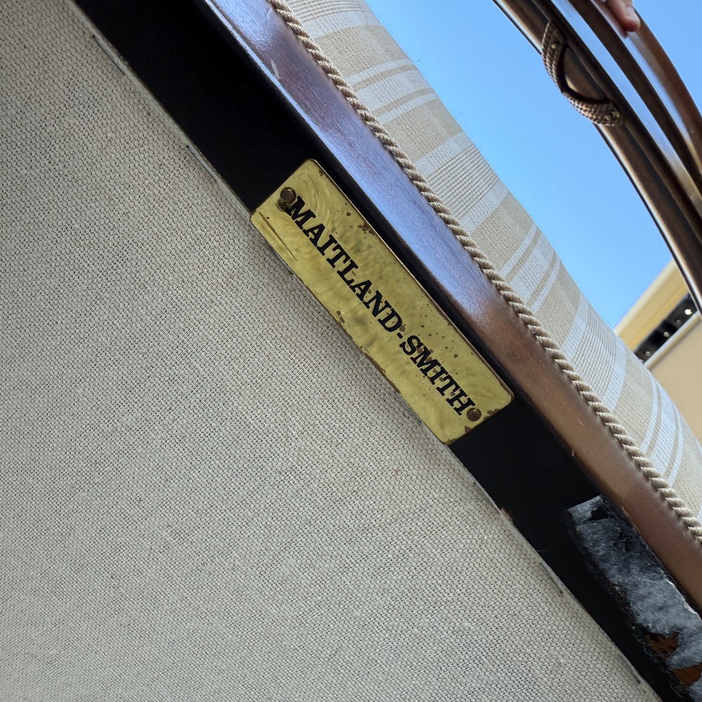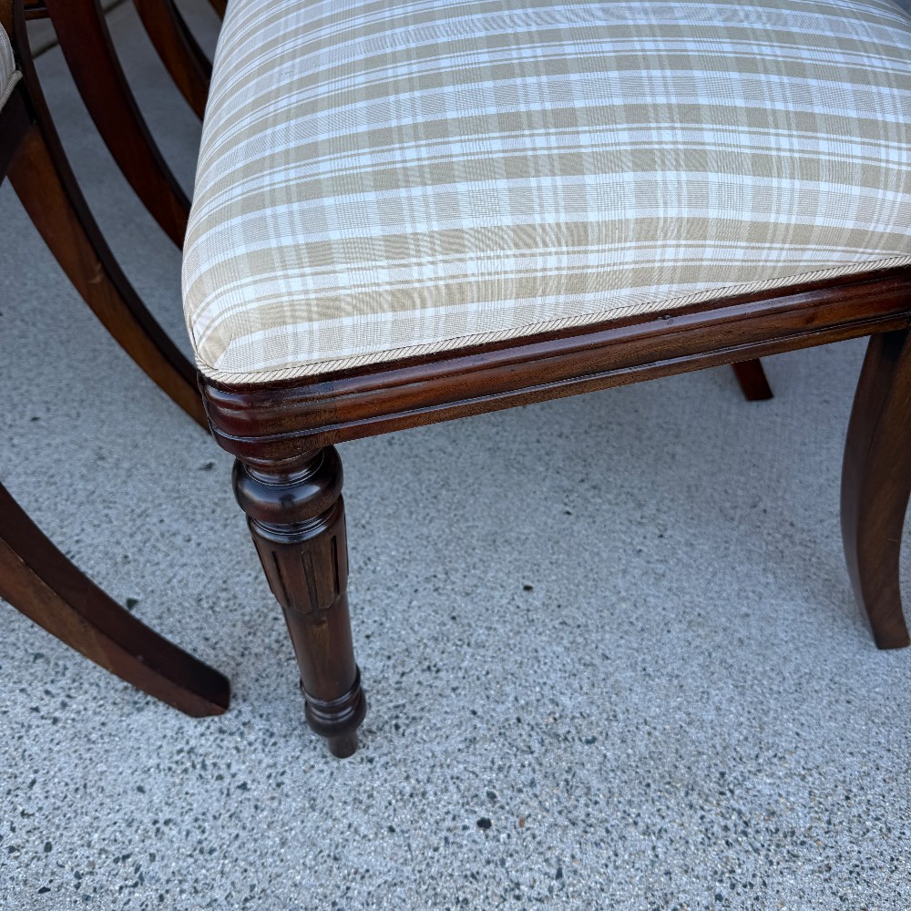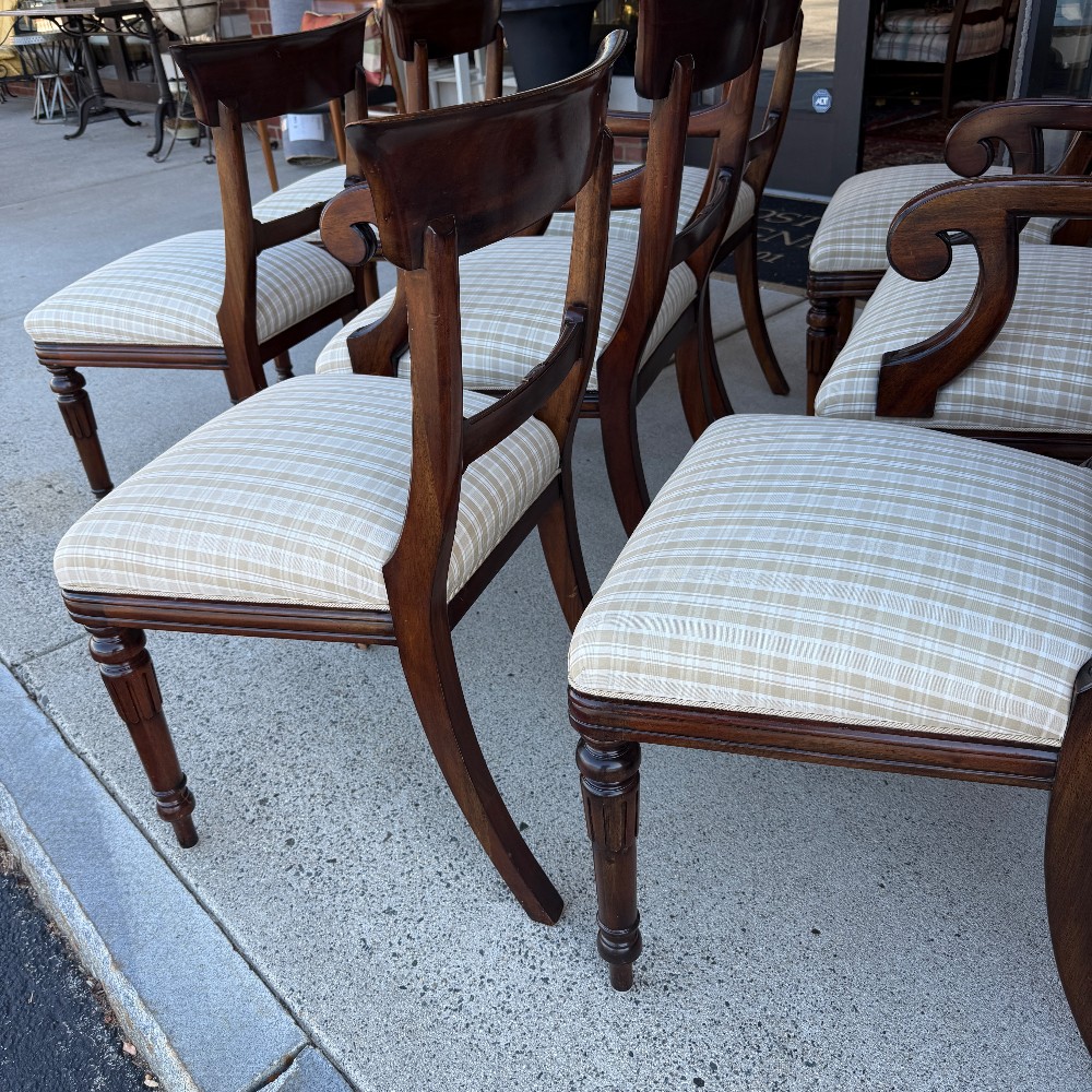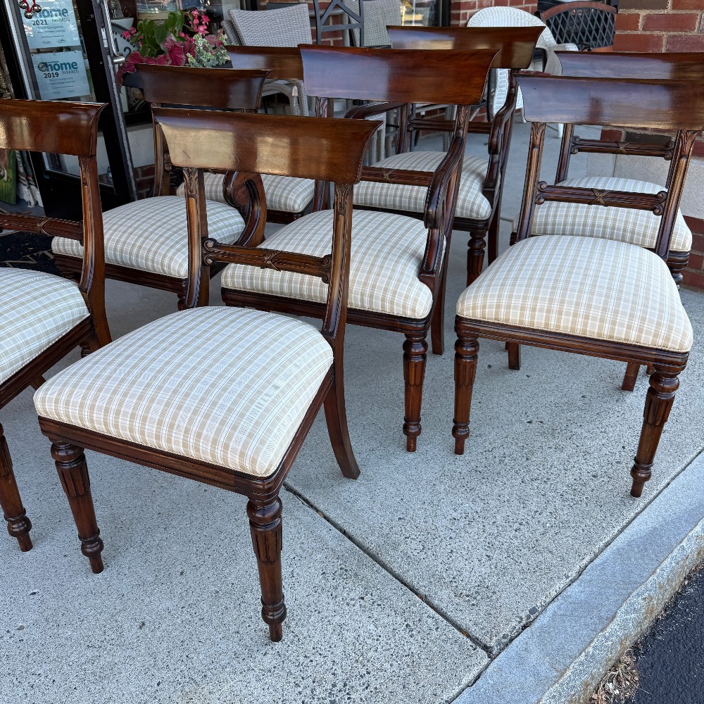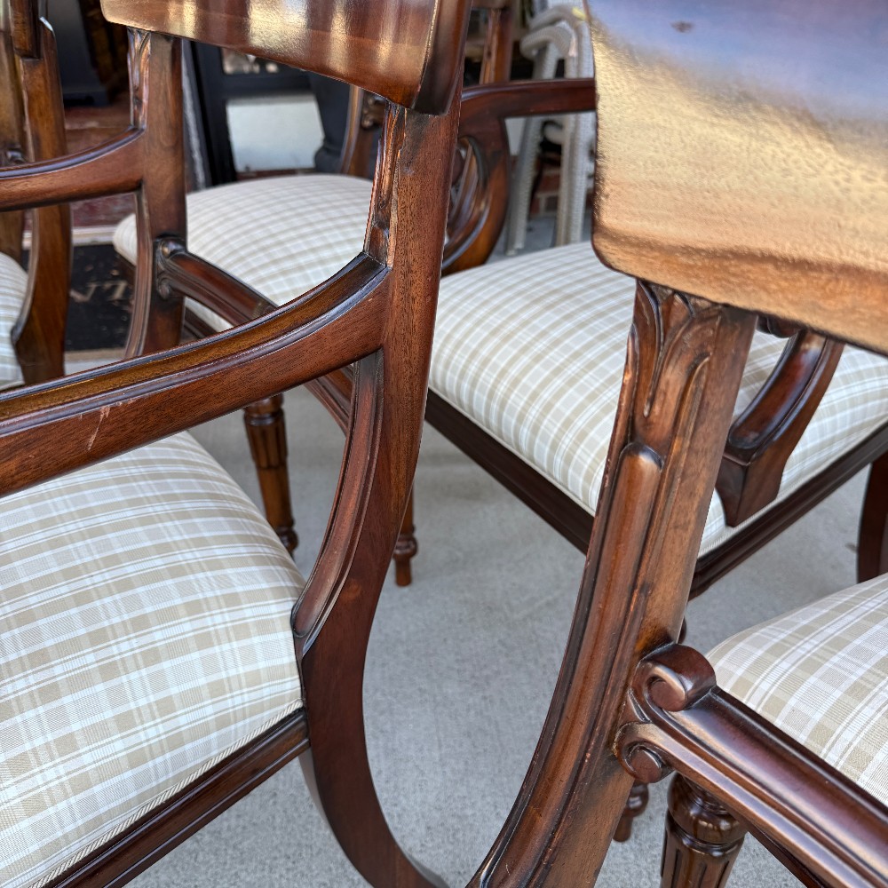 two with arms, 22" w, 23" d, 37" tall and 6 without arms, 20" seat h, 34.5" tall, 22 " wide 23" deep - reupholstered Scalamandre silk check