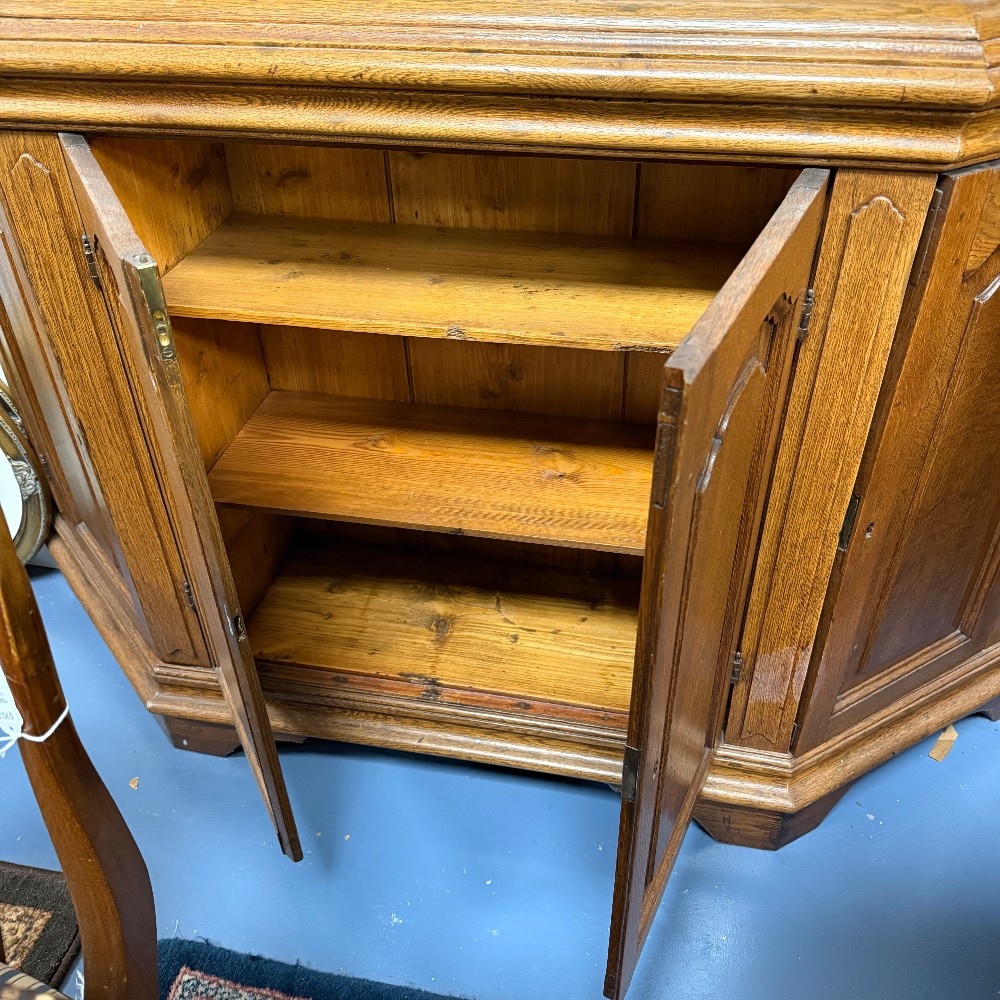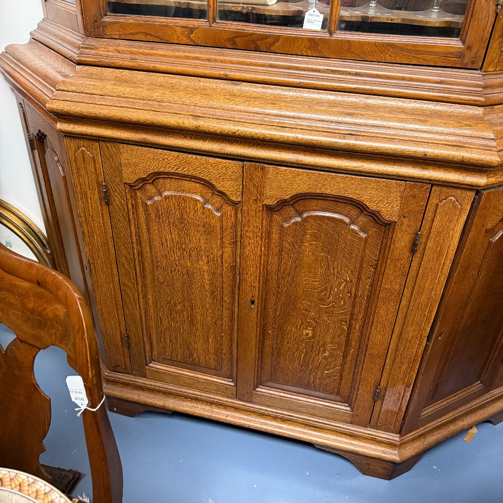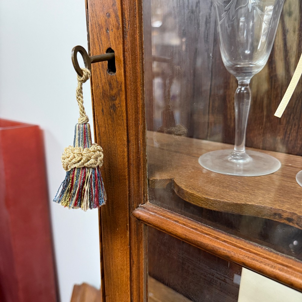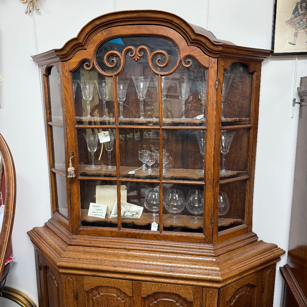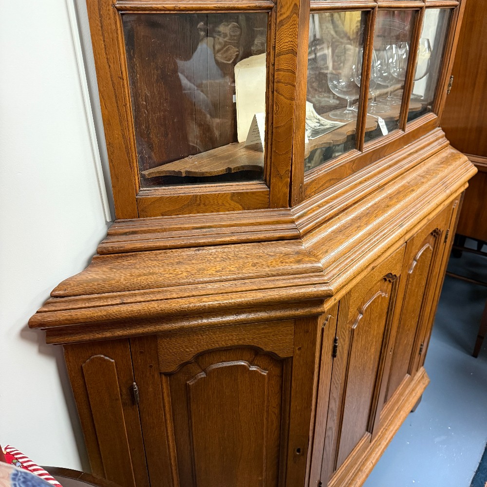 Antique breakfast hutch measuring approx. 80.5”Tx60”Wx14”D Late 18th century with lock and key three cabinets below and one removable glass cabinet on top