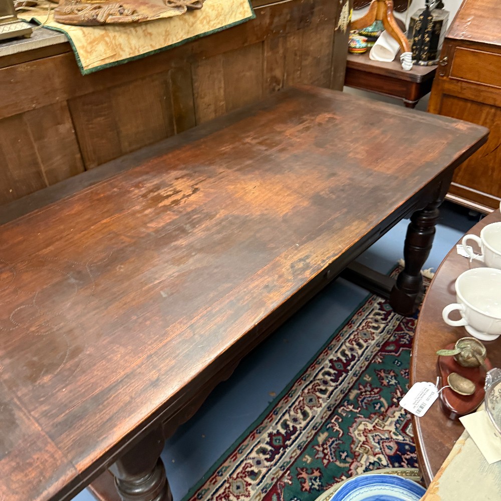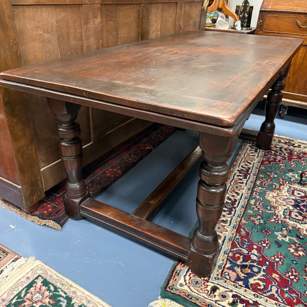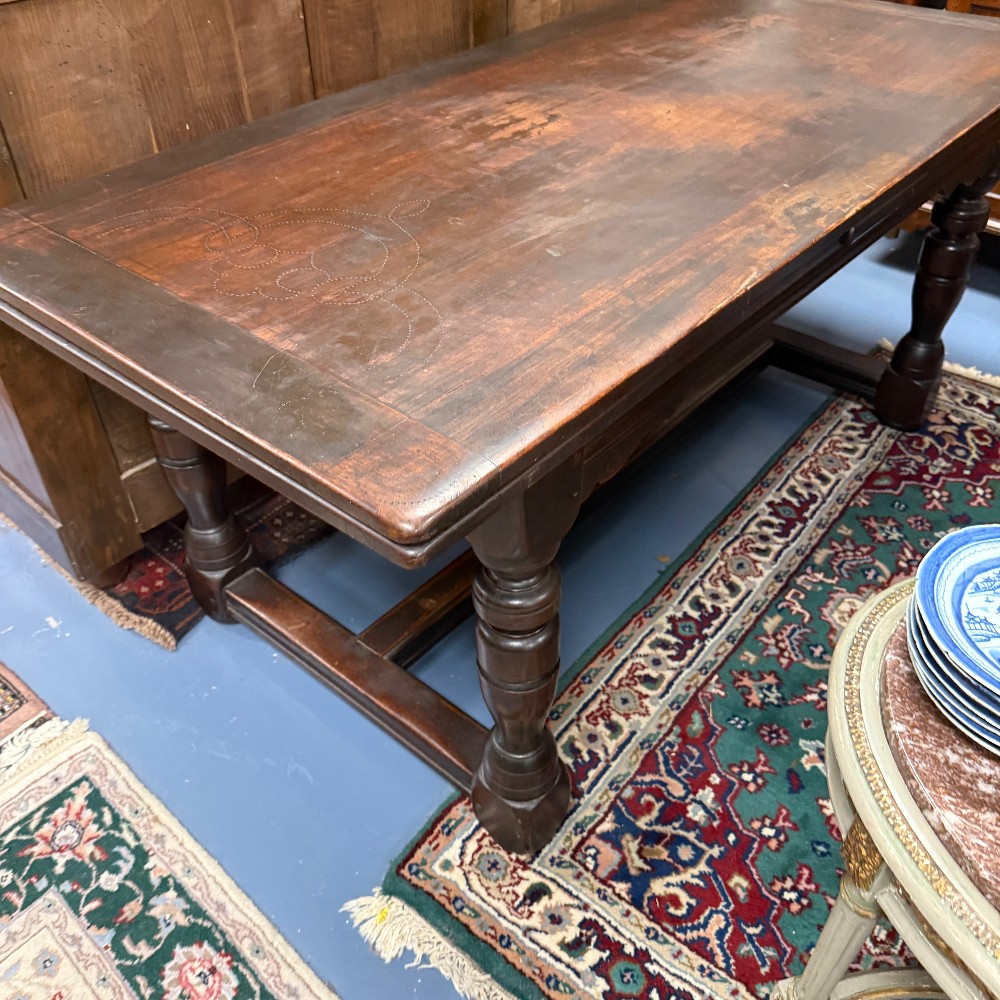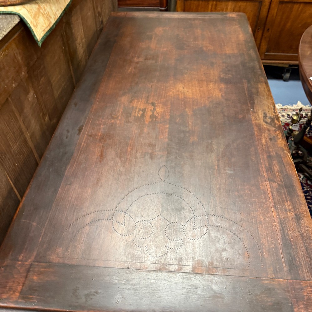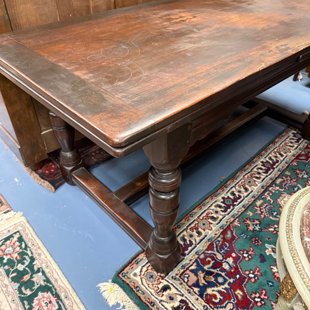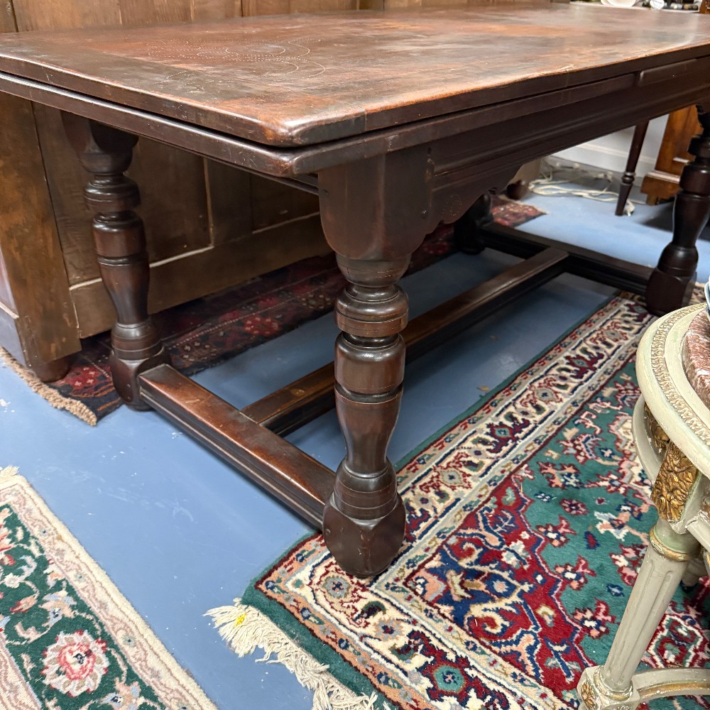 by Berkey & Gay, each extension is 28.5" and sitting table is 32" wide, 30" wide and 66.5" Long with two ext's.