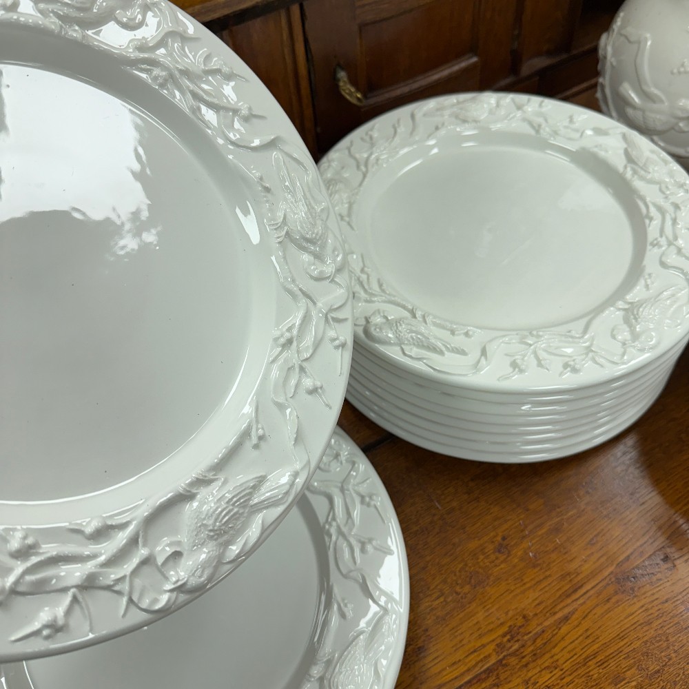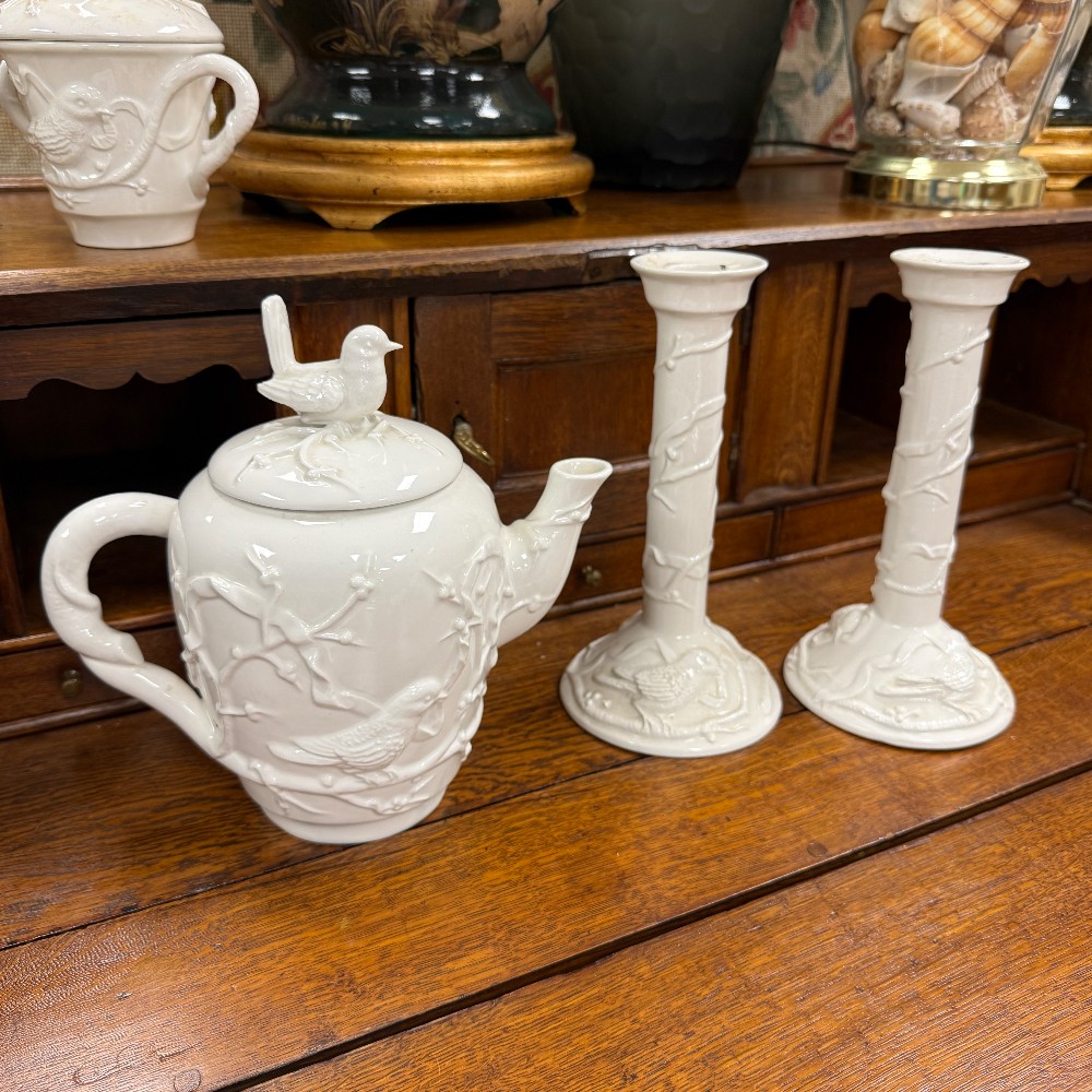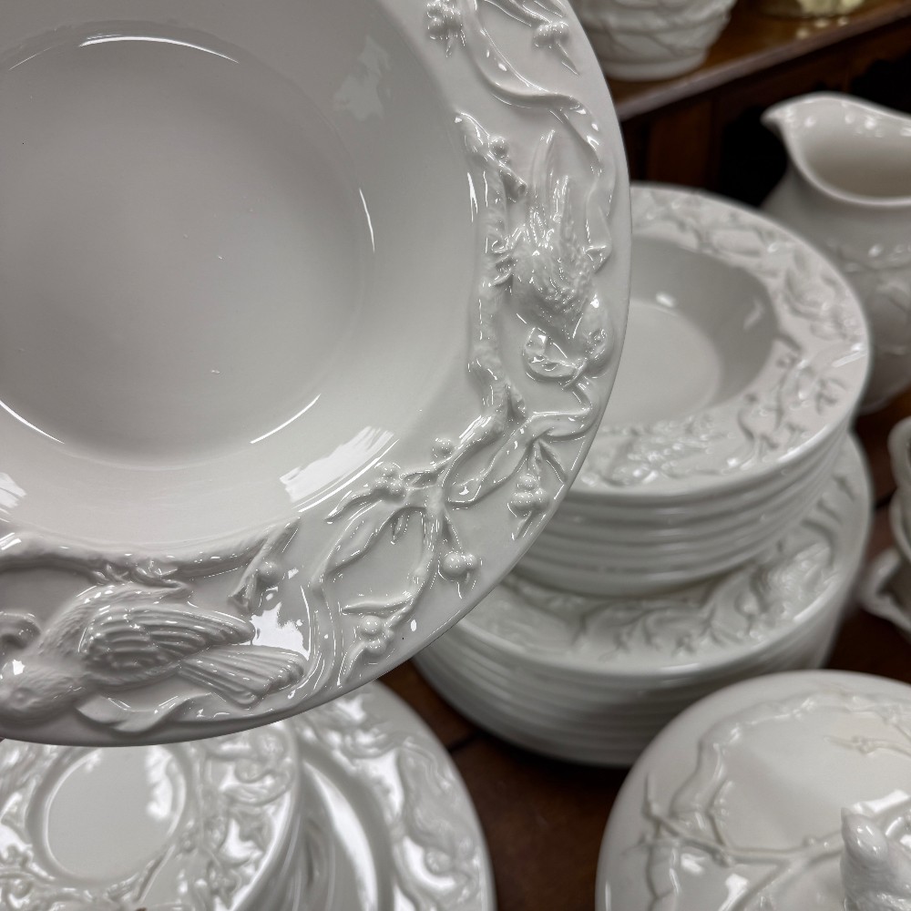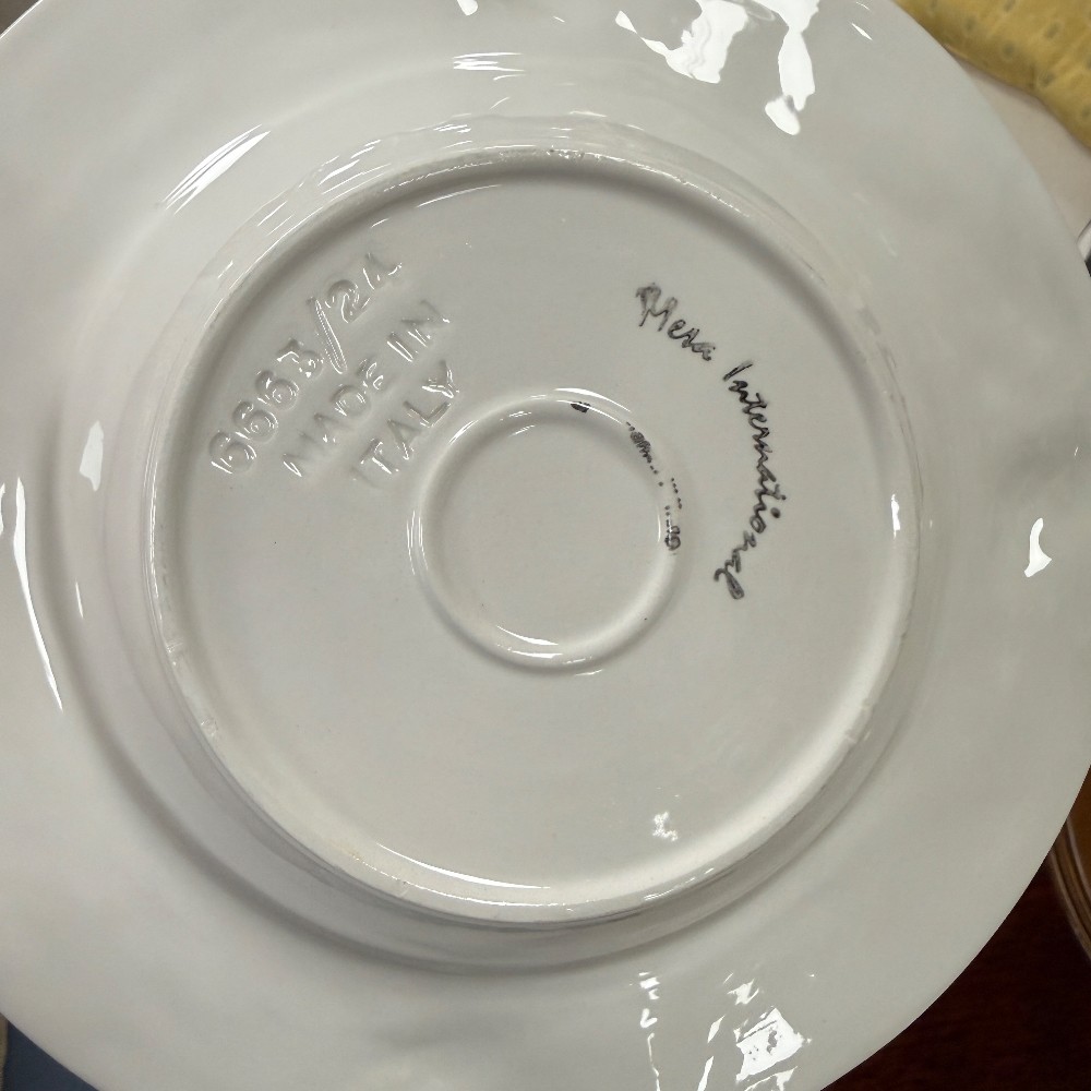 66 pieces total : 12 dinner plates (11"d), 12 salad plates(9"d), 12 soup bowls (9.5"d), 12 cups/saucers (6"d), sugar / creamer, candle sticks, tea kettle, water pitcher, covered bowl with handles, Large Bowl `14.5" D x 3" T
