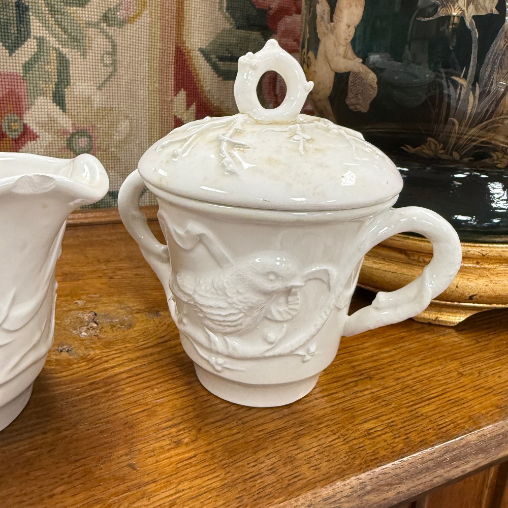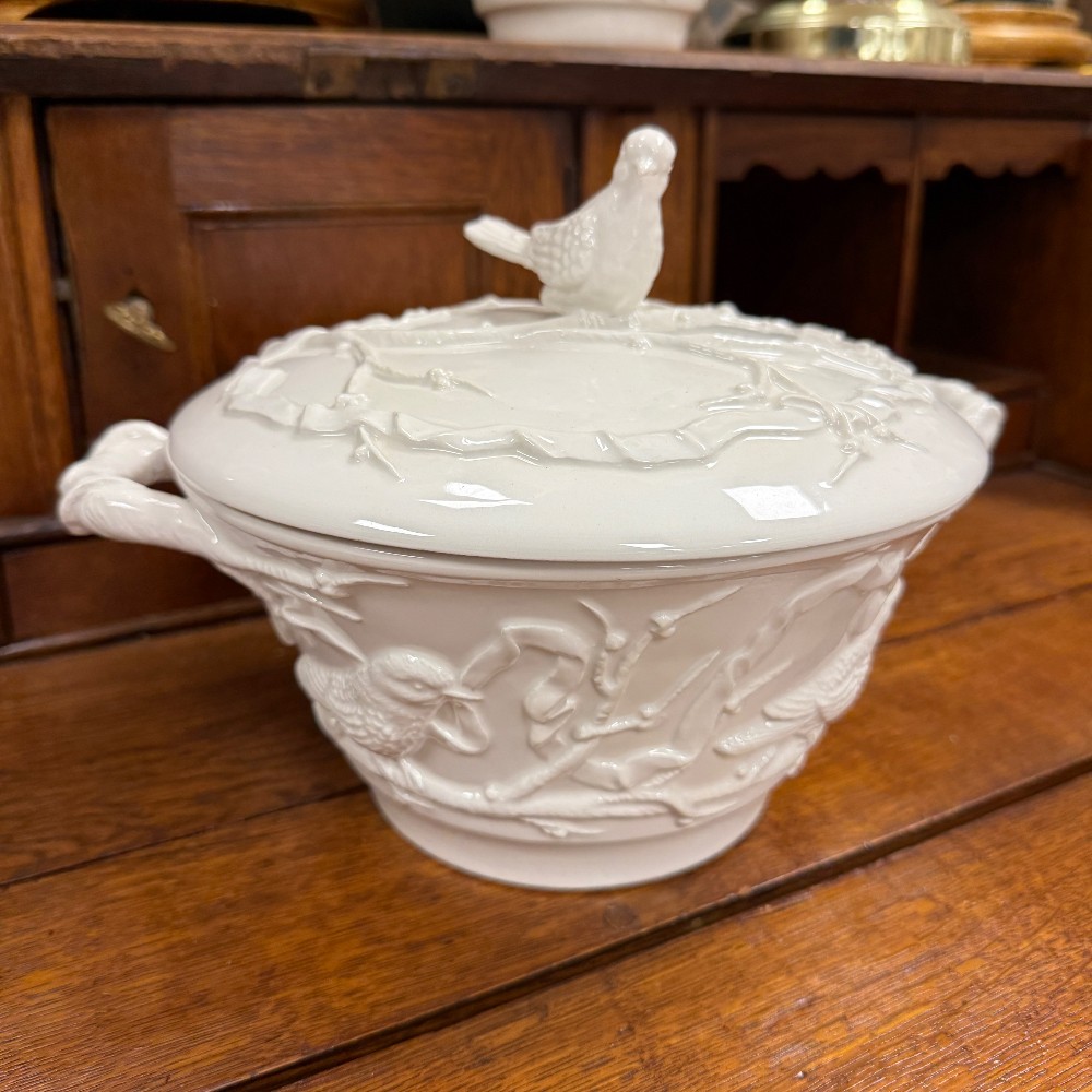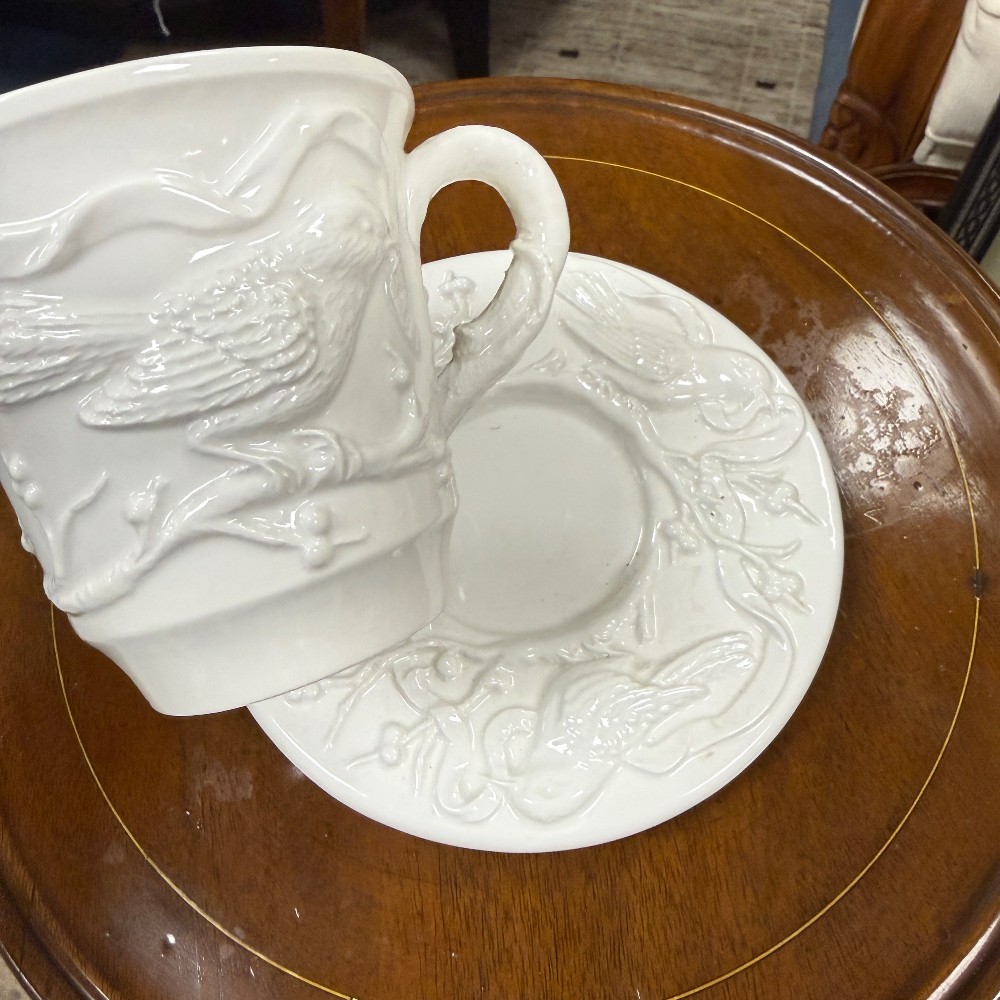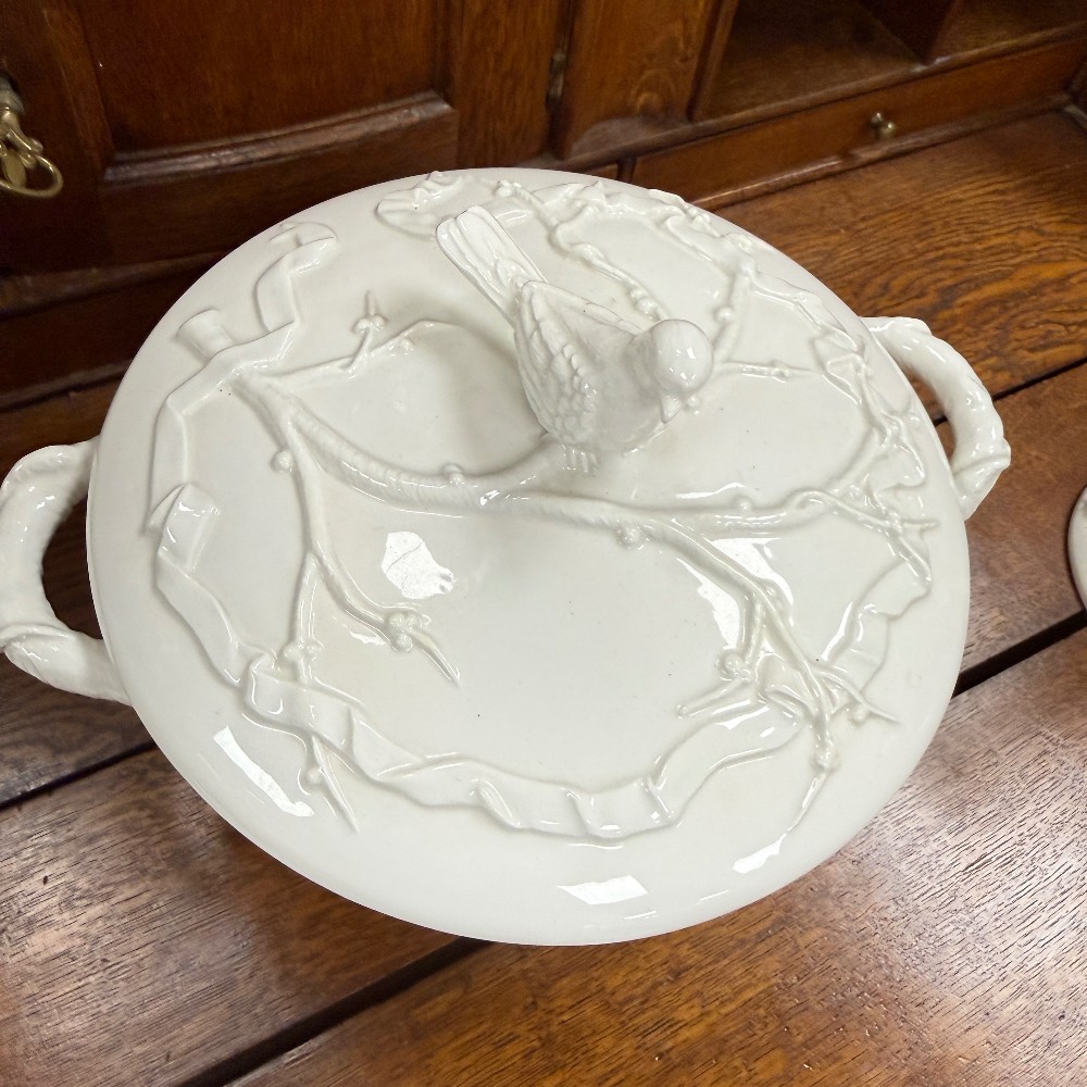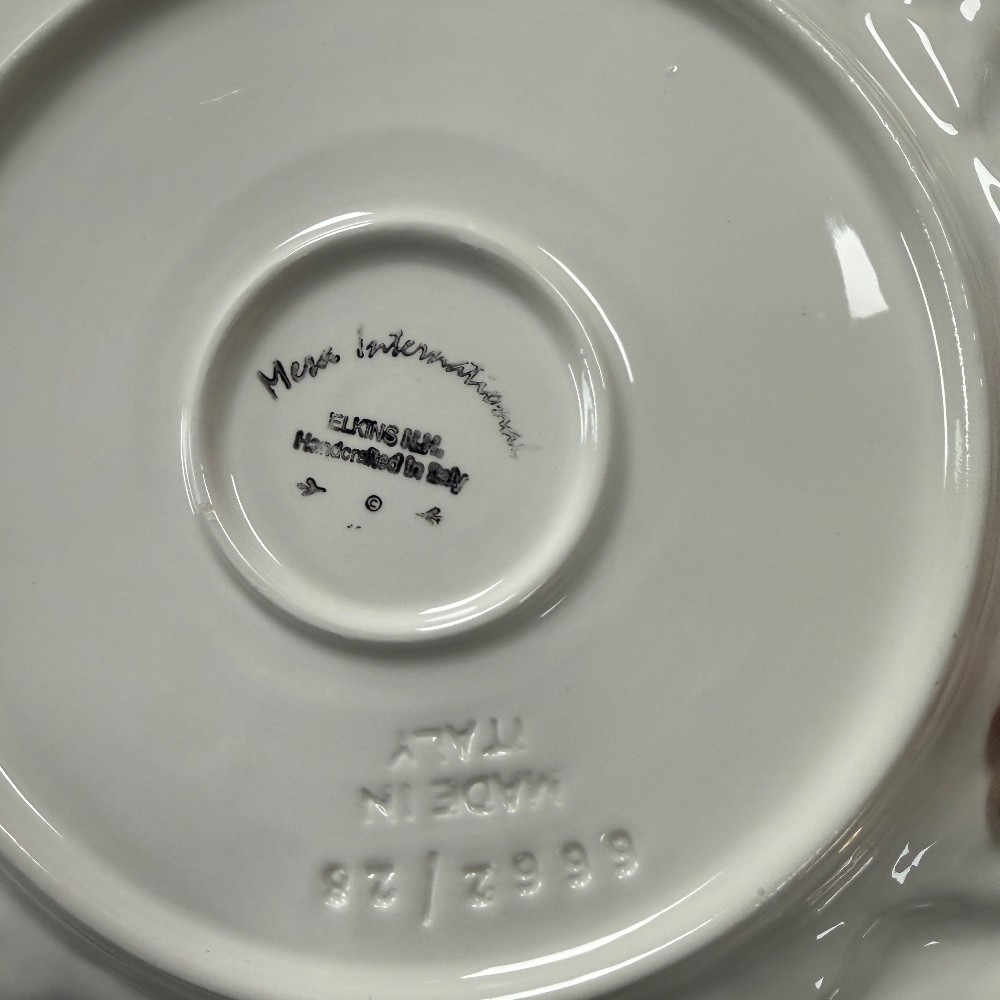 66 pieces total : 12 dinner plates (11"d), 12 salad plates(9"d), 12 soup bowls (9.5"d), 12 cups/saucers (6"d), sugar / creamer, candle sticks, tea kettle, water pitcher, covered bowl with handles, Large Bowl `14.5" D x 3" T