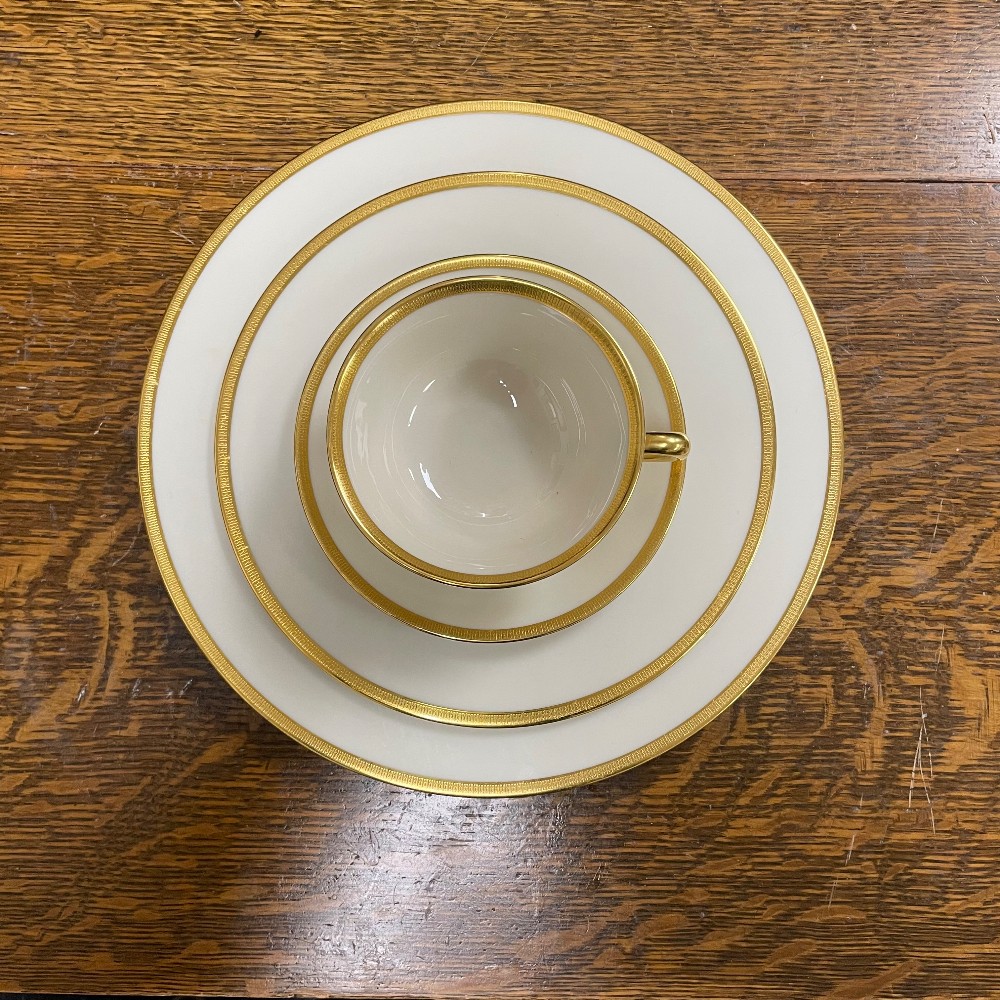 12 Saucers (5.75"), 12 Tea Cups (4" D, 2" H), 12 Dessert Plates (6.25" D), 12 Salad Plates (8.25"), 12 Soup Bowls (8.25" D), 12 Dinner Plates (10.5" D) Dines 12 People.
