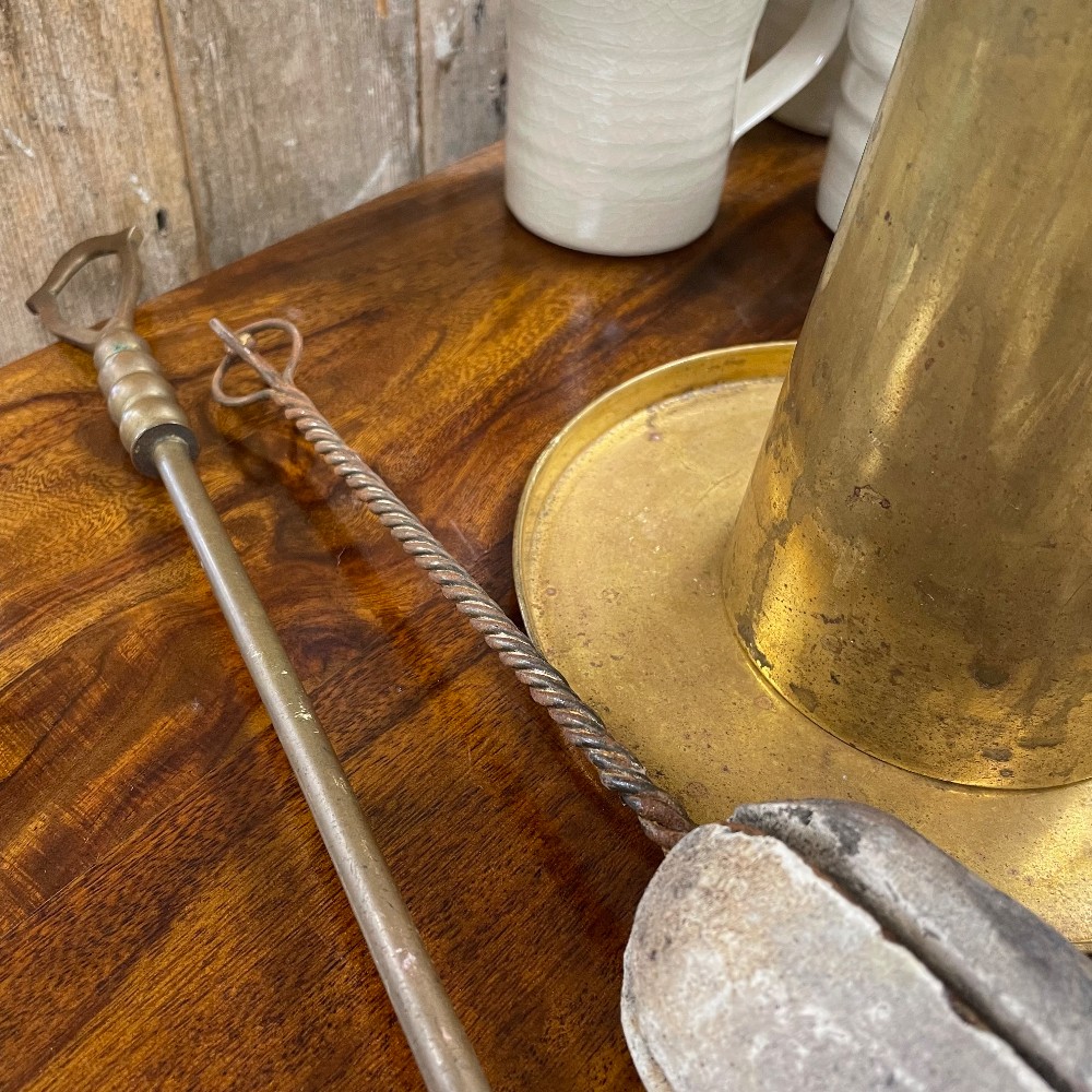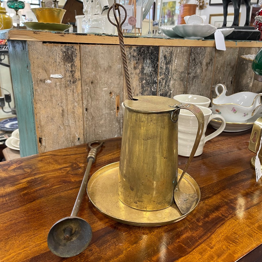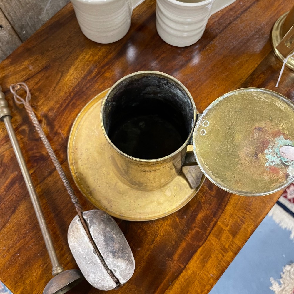 Brass Tray, Pitcher, Fire Starter, Candle Snuffer. Condition as pictured.
