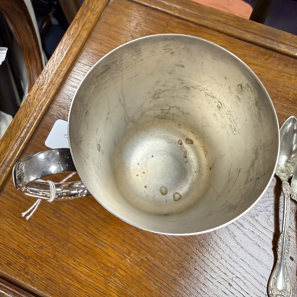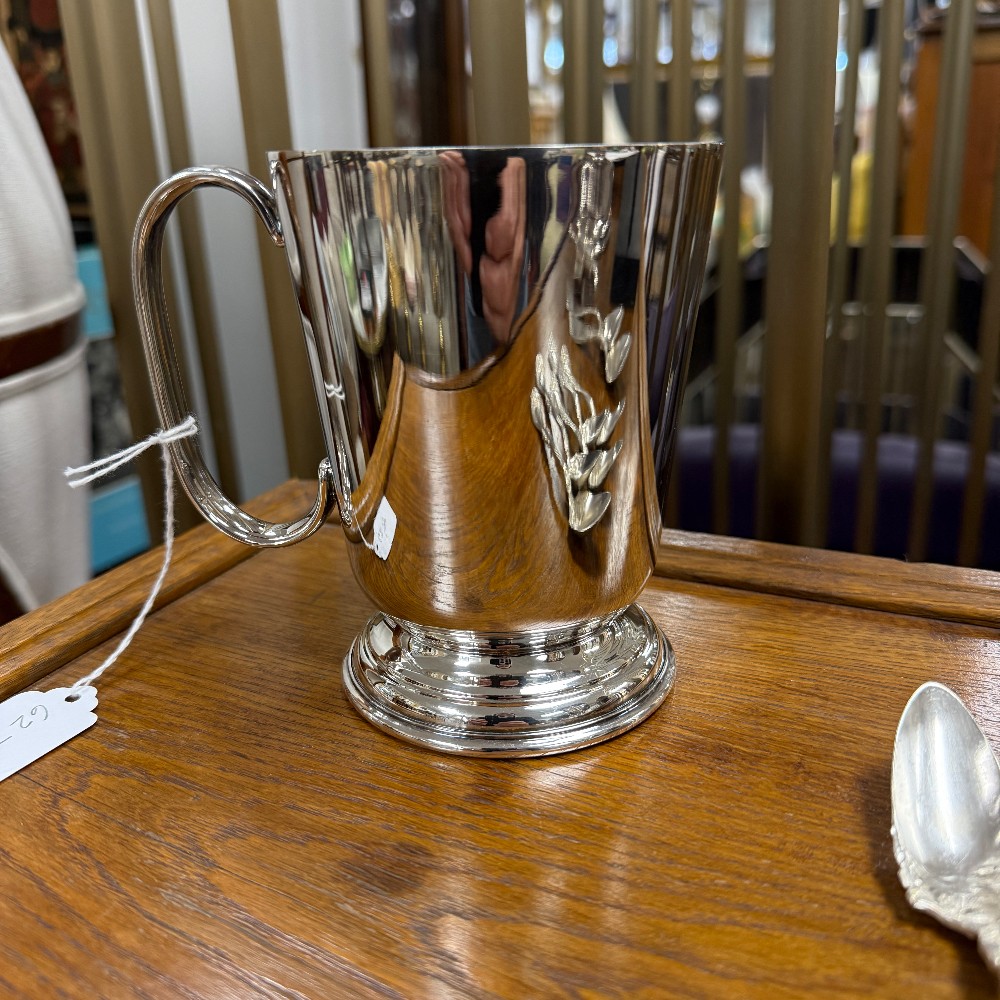 5" tall 4" d, english beer mug, stein - silver plate, old