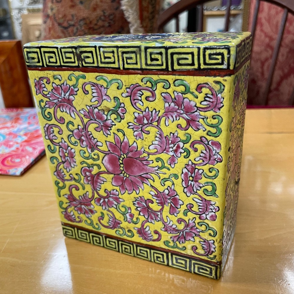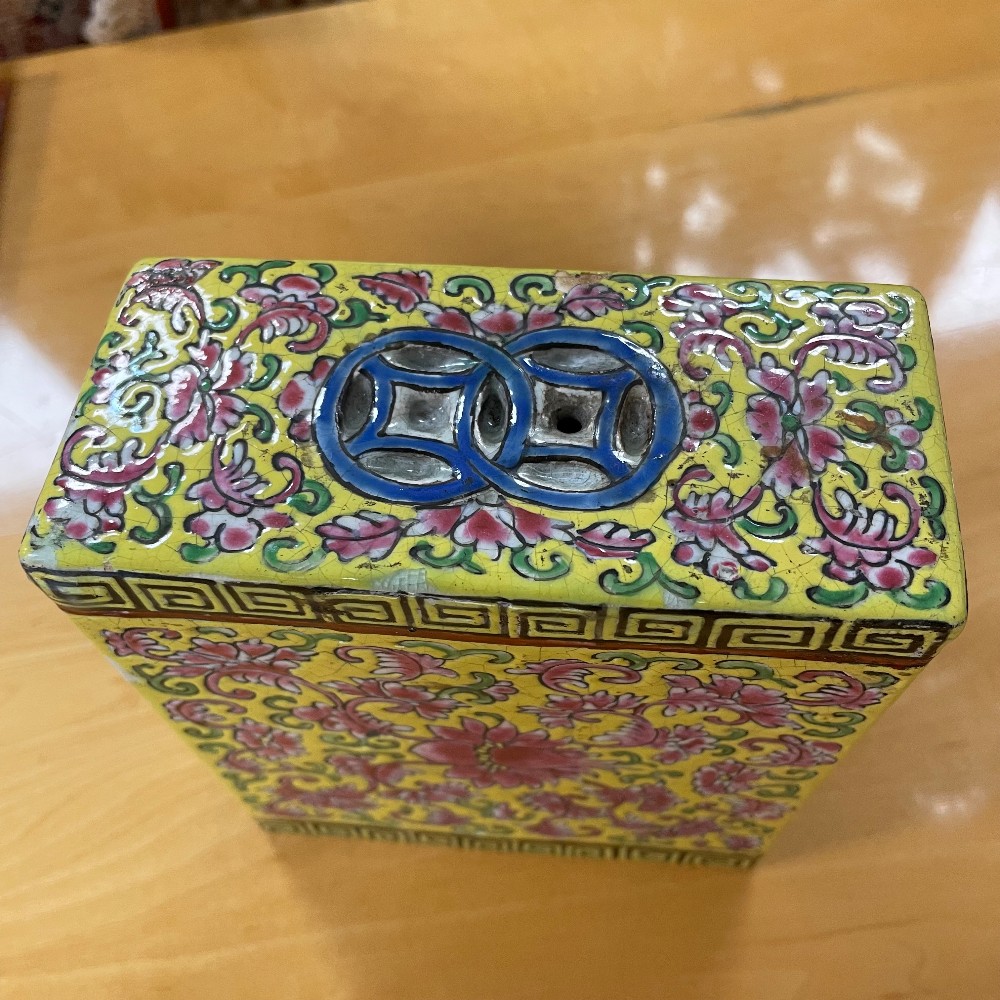 Measuring 6"T x 5"W x 2 1/2"D. Yellow, pink and green