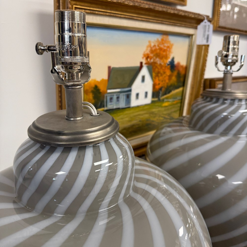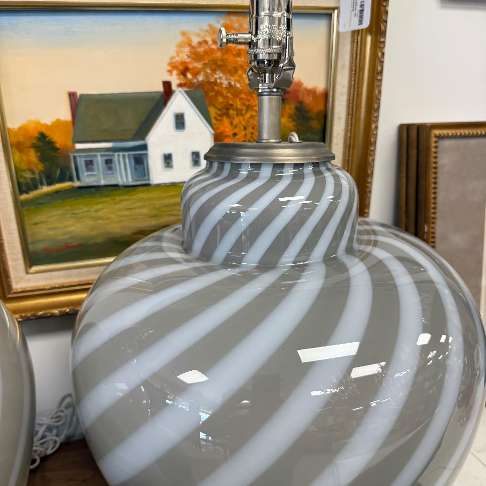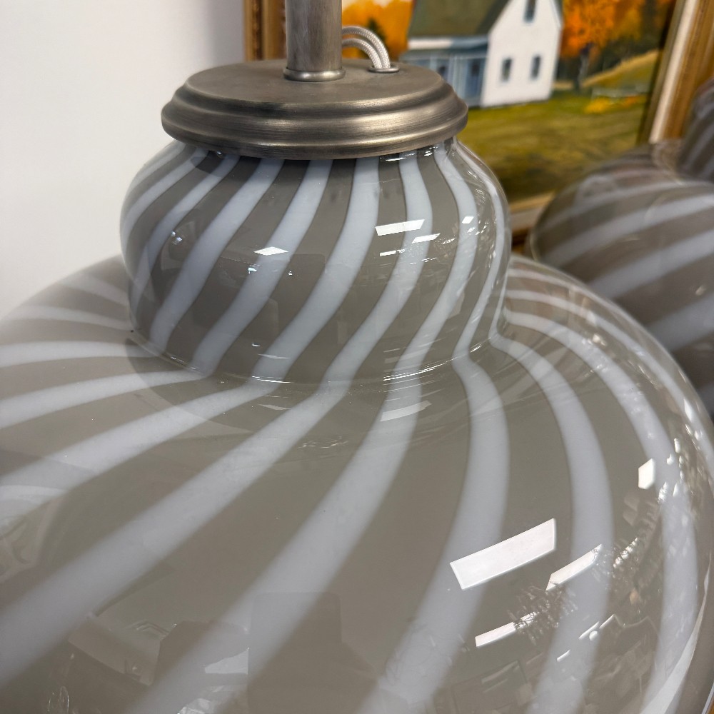 swirl glass, velvet bottom, chrome fixtures, long cords 21" tall, 14" d and 17" top of glass"
