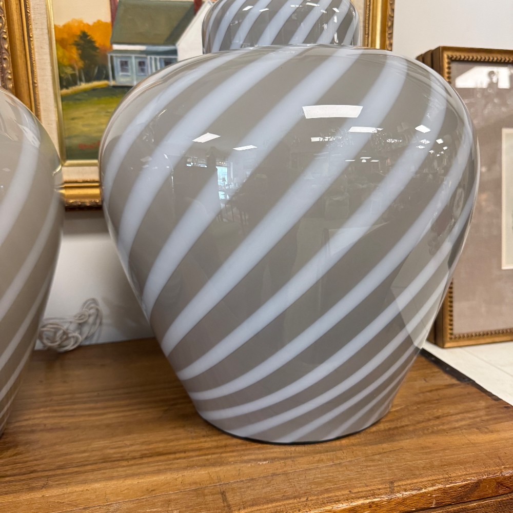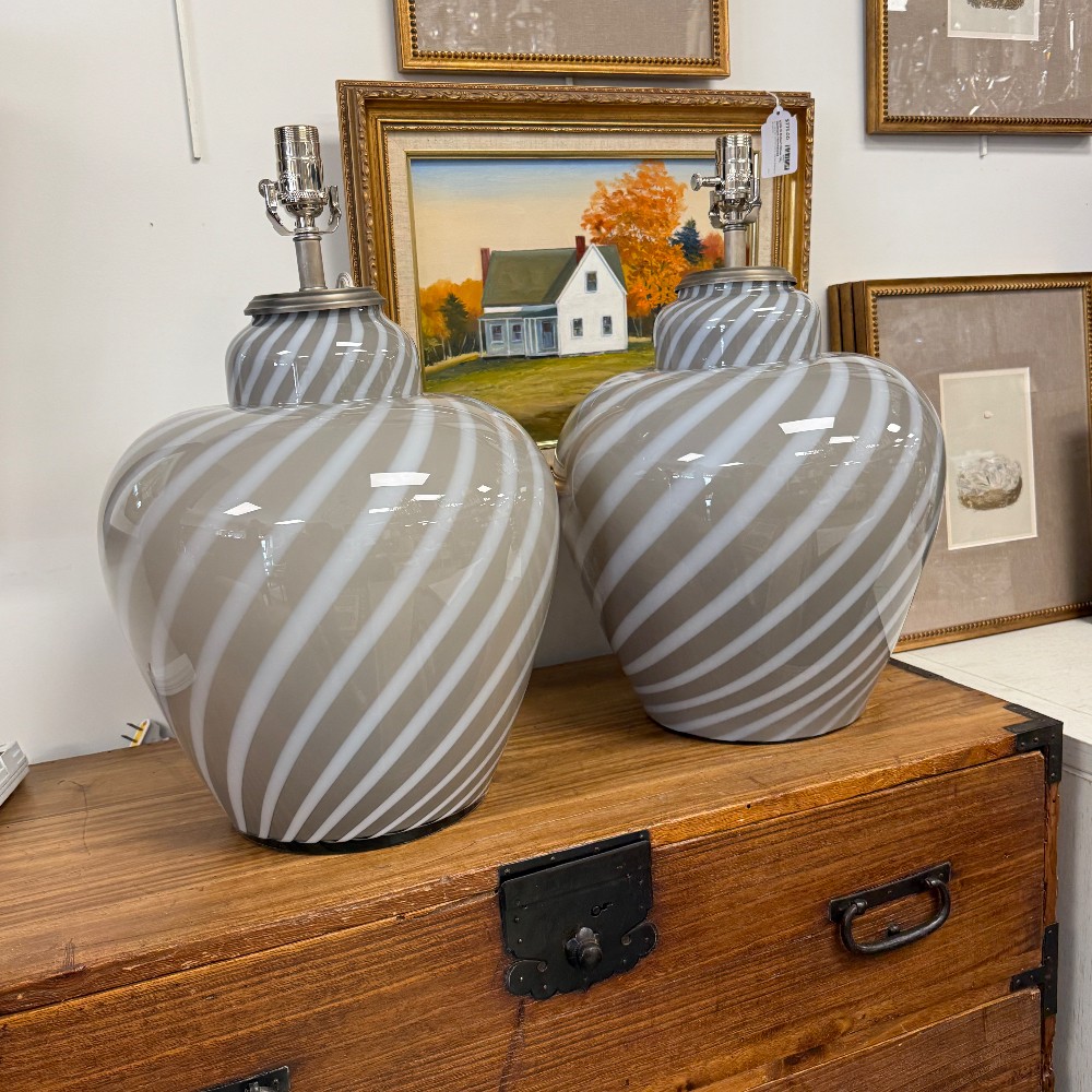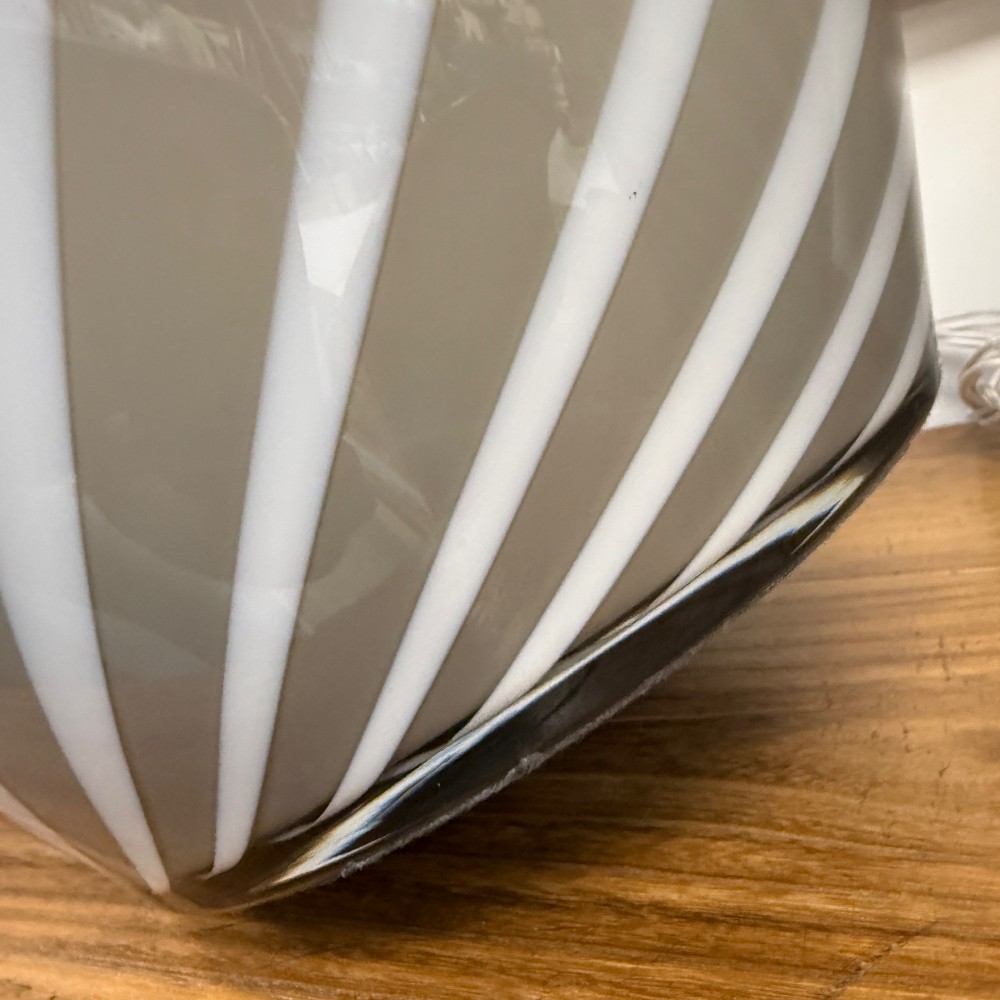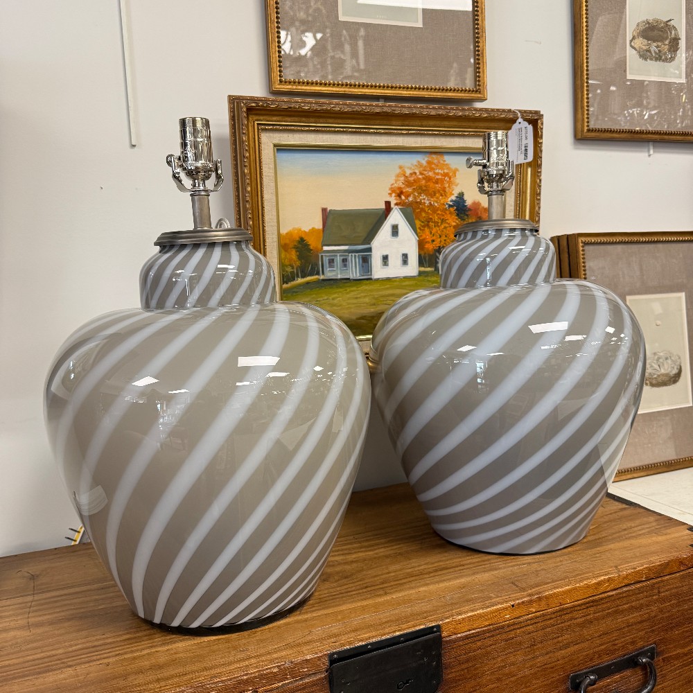 swirl glass, velvet bottom, chrome fixtures, long cords 21" tall, 14" d and 17" top of glass"