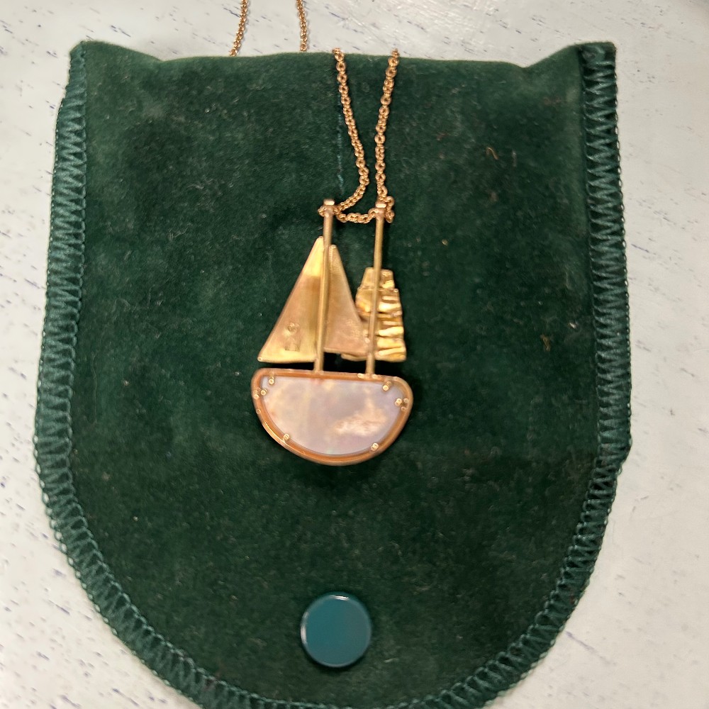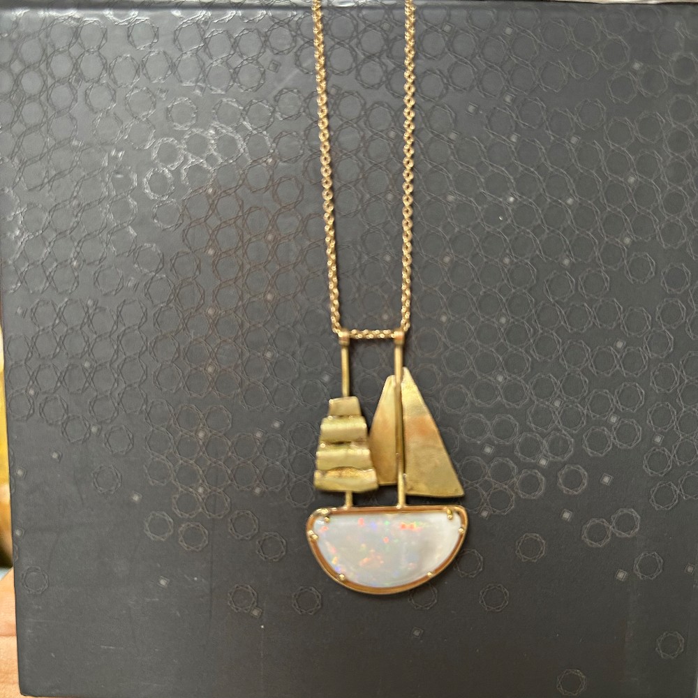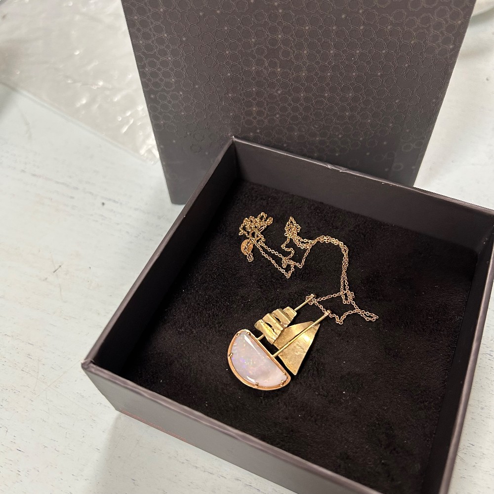 Handmade, 9k, designed by talented Australian jewelry designer. Measuring 9 1/2"L/ Pendant 1 1/2"T x 1"W. In box. Condition as pictured.