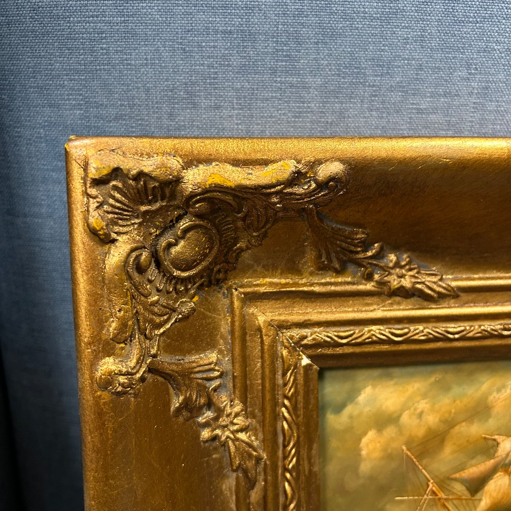 Gilt frame. Measuring 13"W x 11"T x 2"D. Condition as pictured