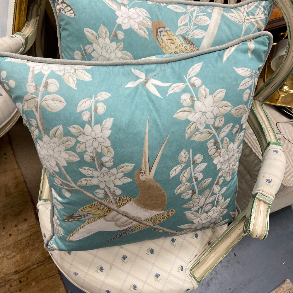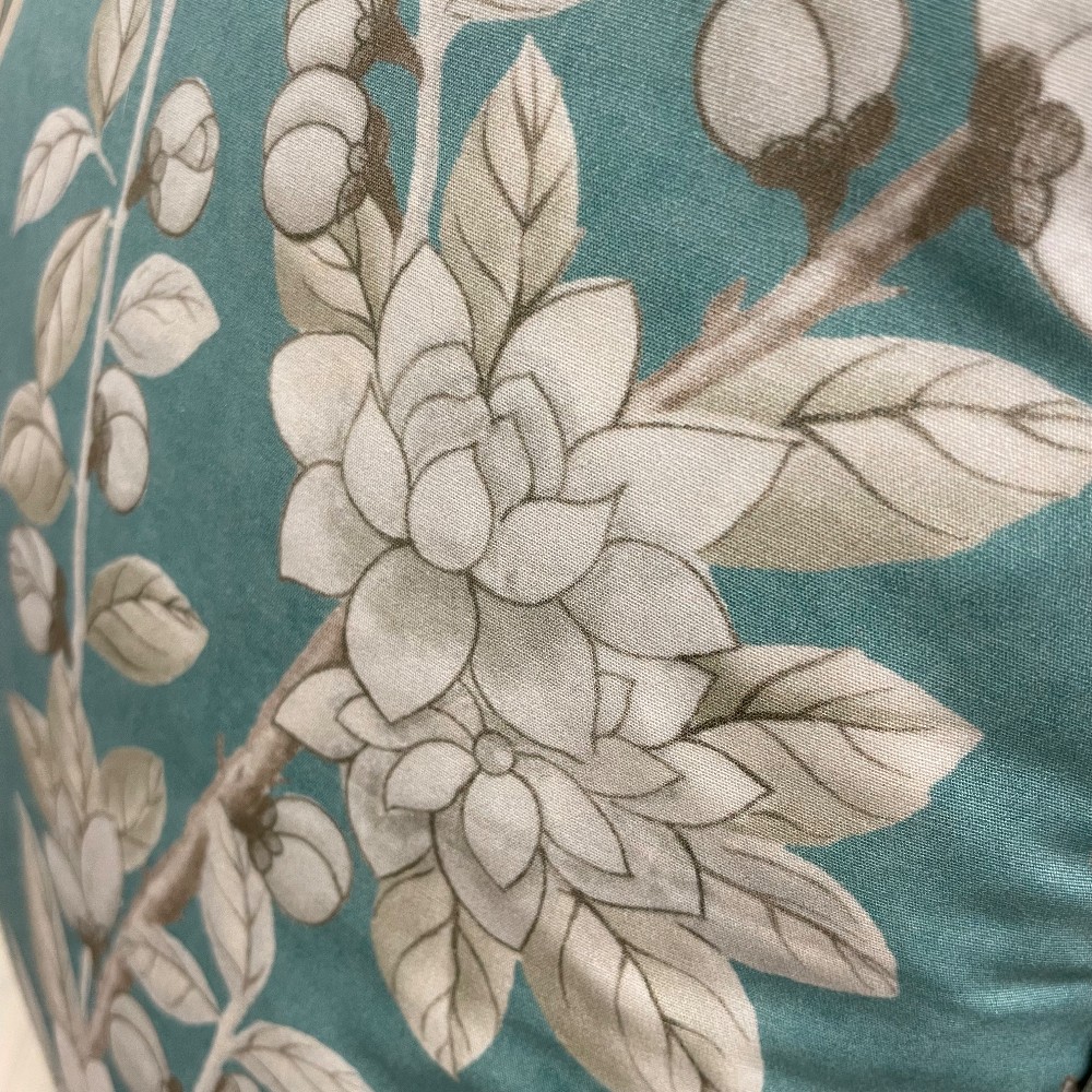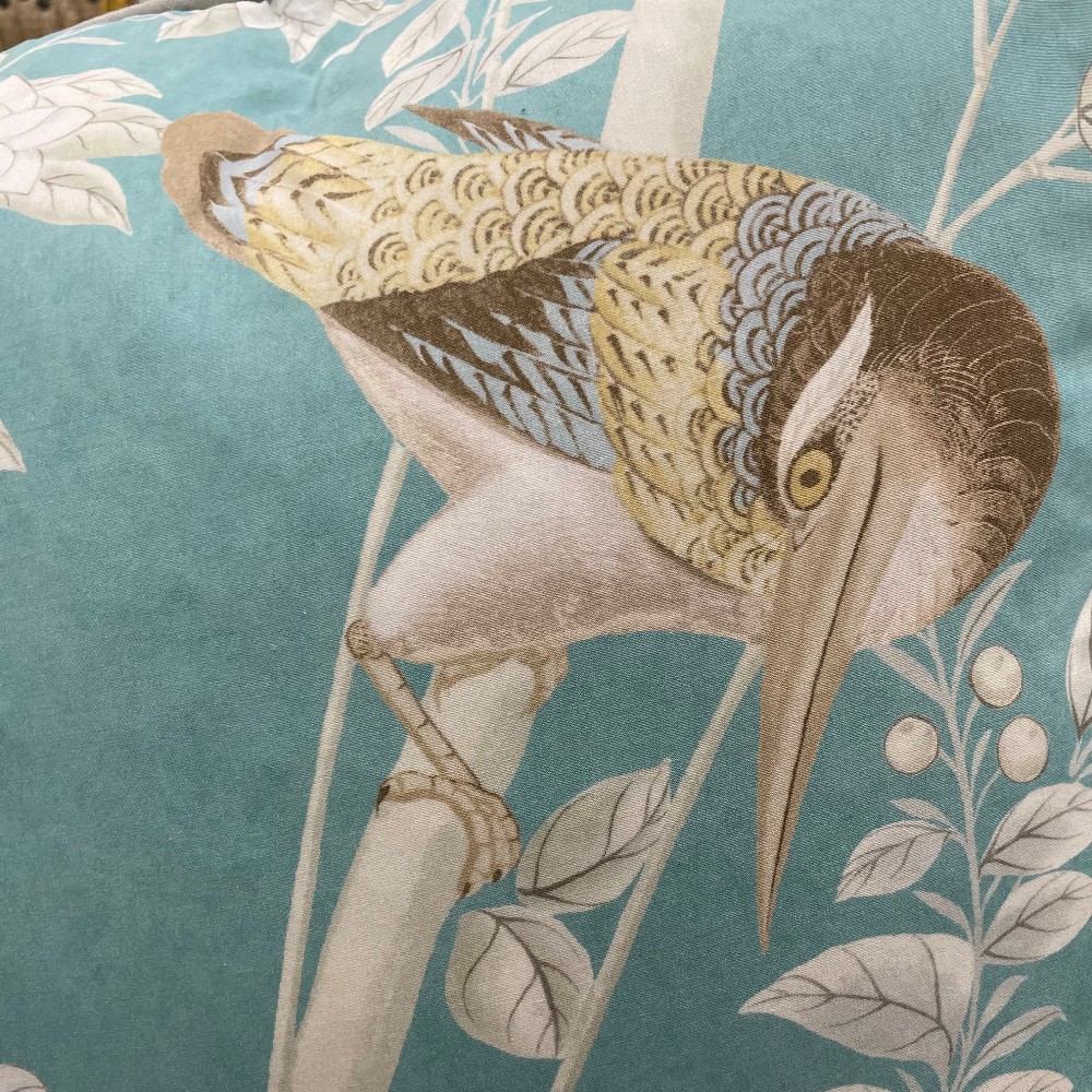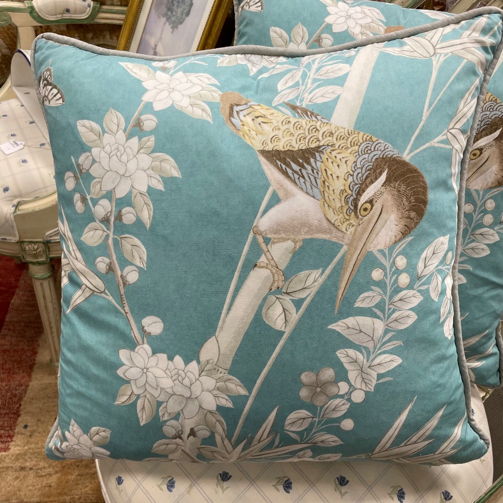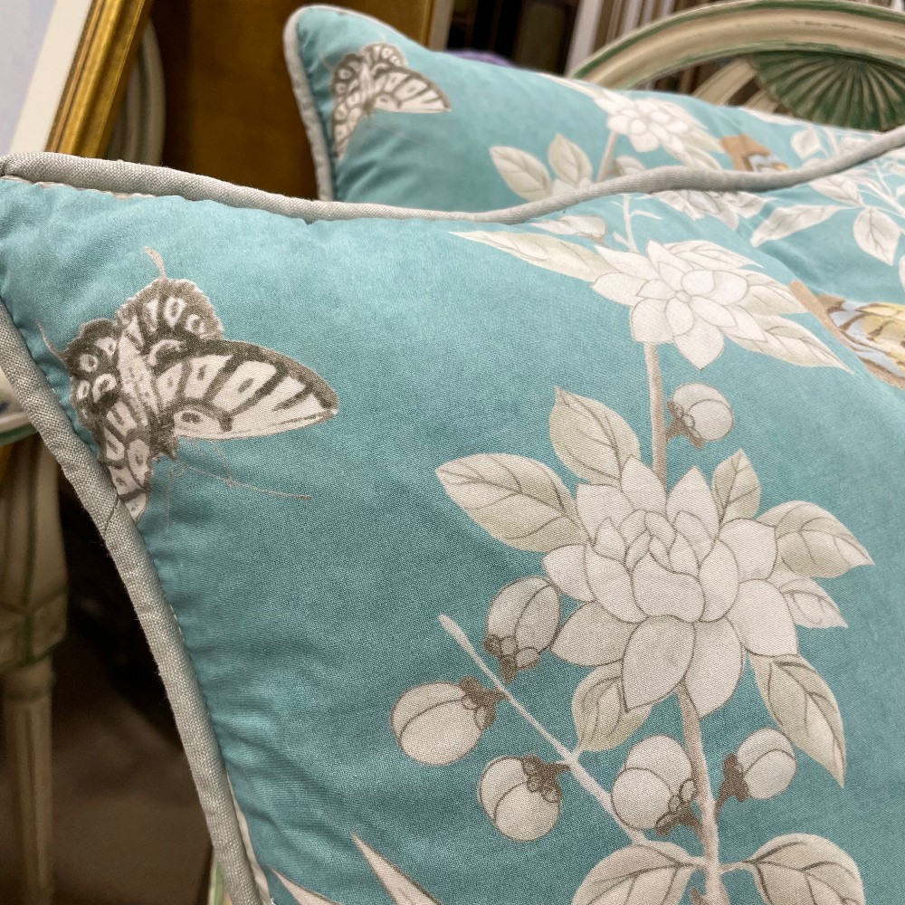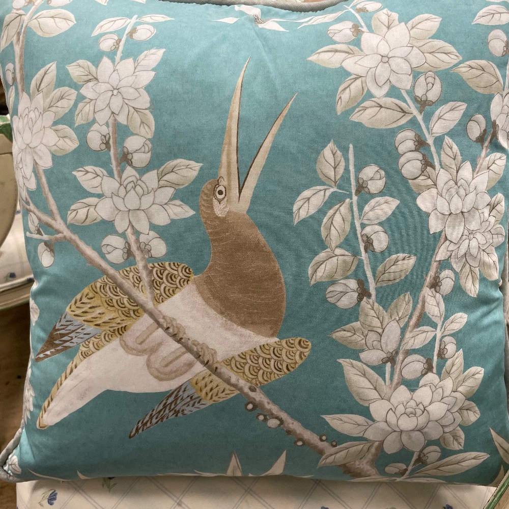 Brighton Pavilionin Peacock, soft blue. Measuring 21" x 21" x 7"D. Soft blue gray piping