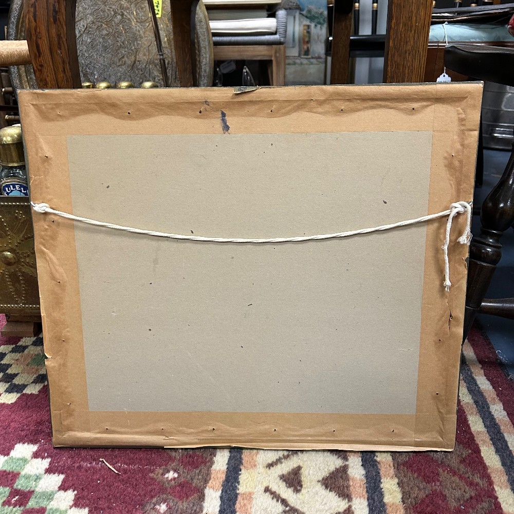 19.75" W, 17" H, black wood frame with gold painted detail. Antique.