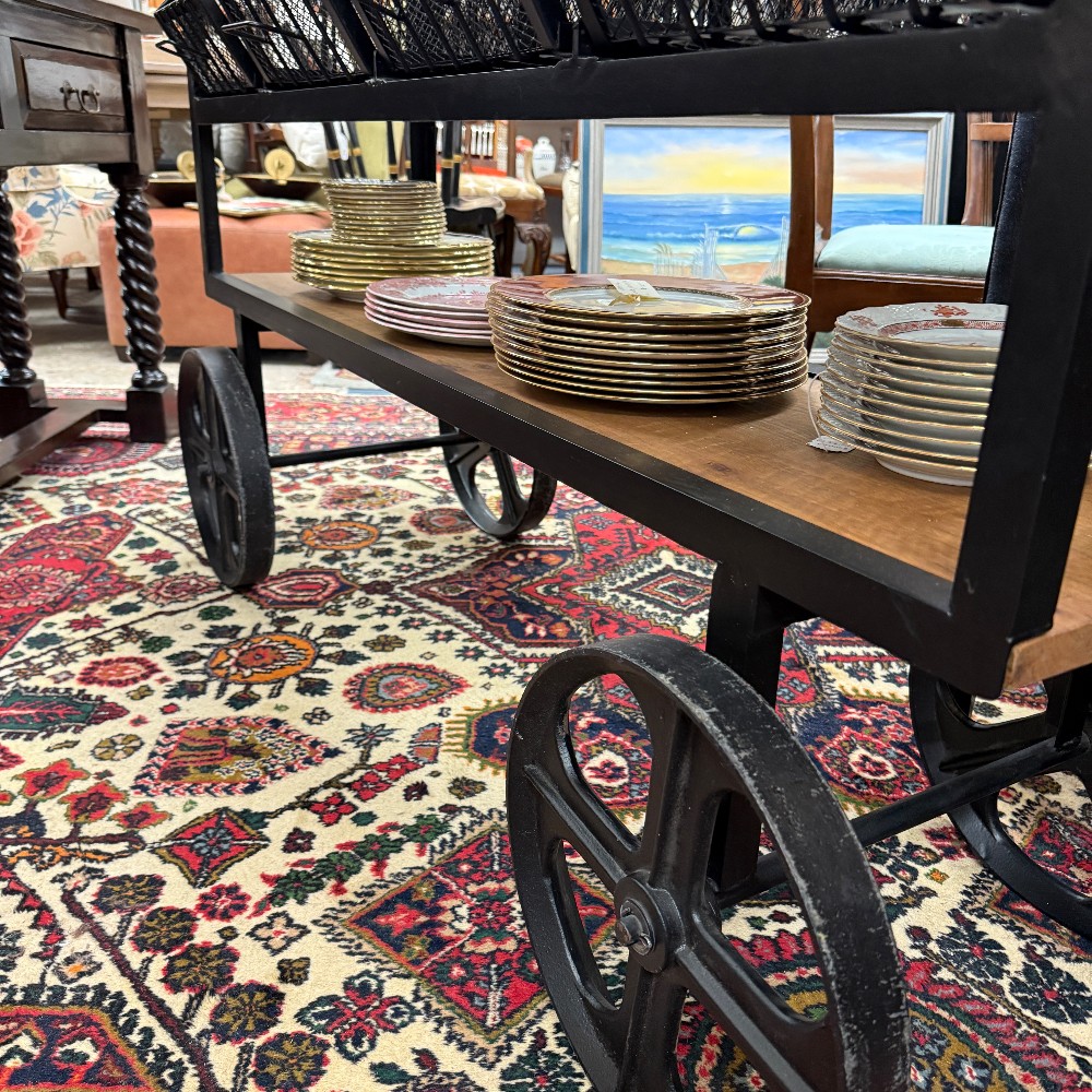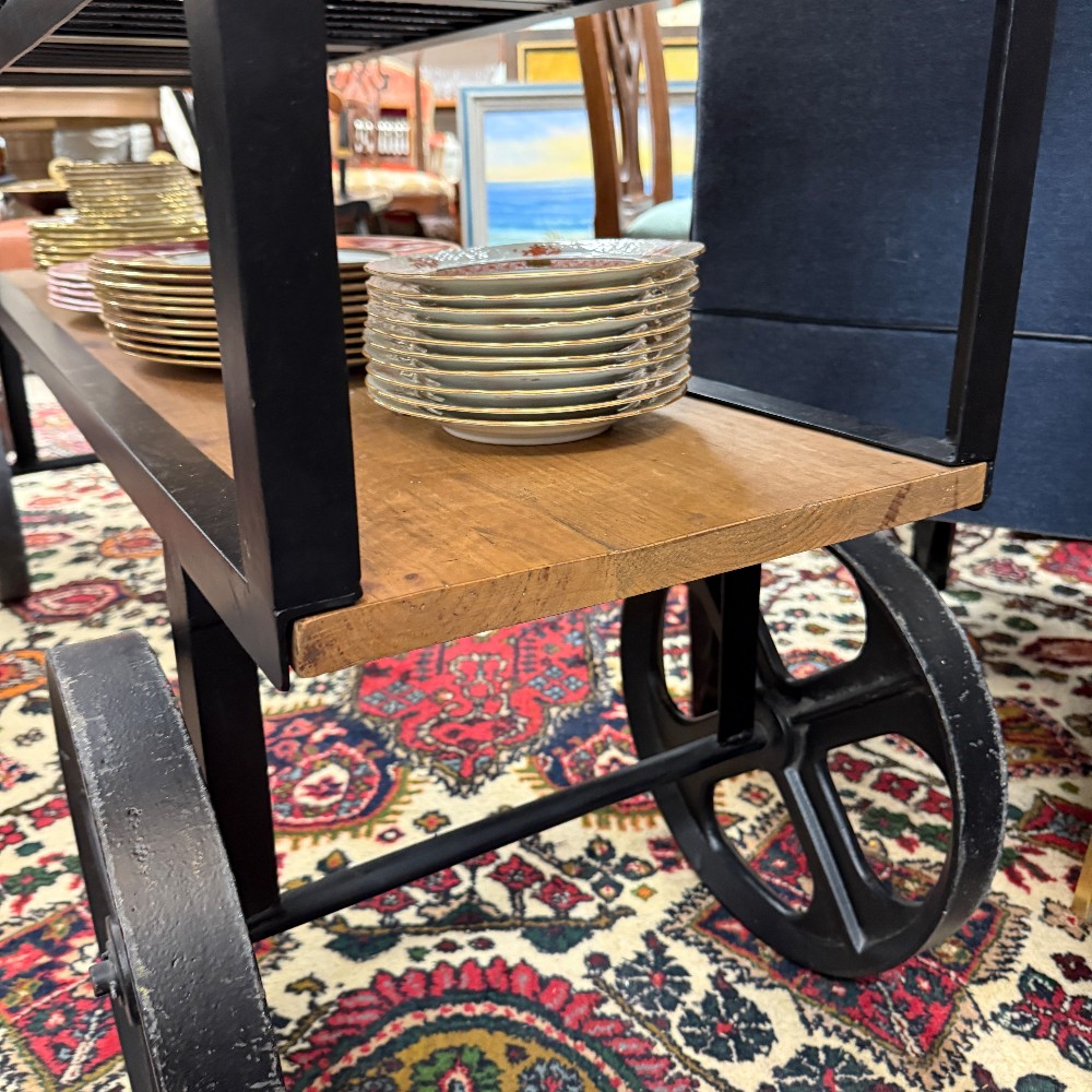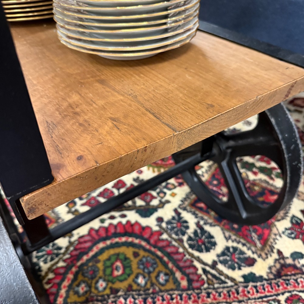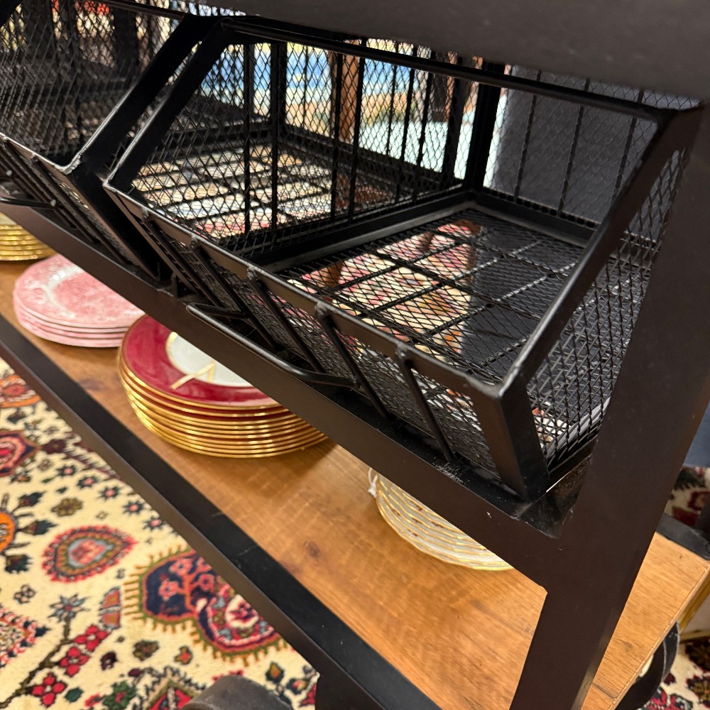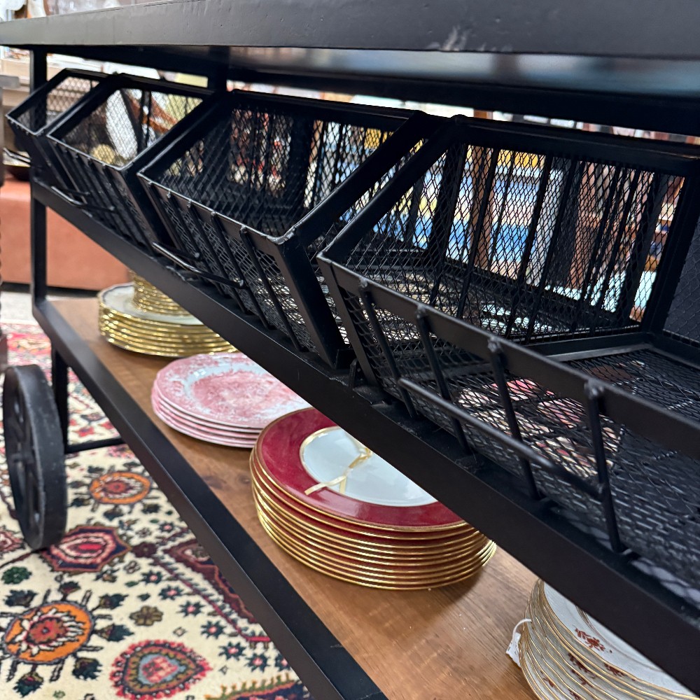 with drawers, wire metal and metal top, rustic pine 19" wide, 60" long, 36" tall (heavy!).