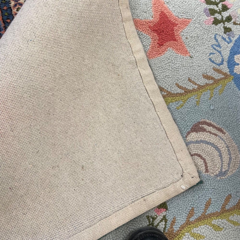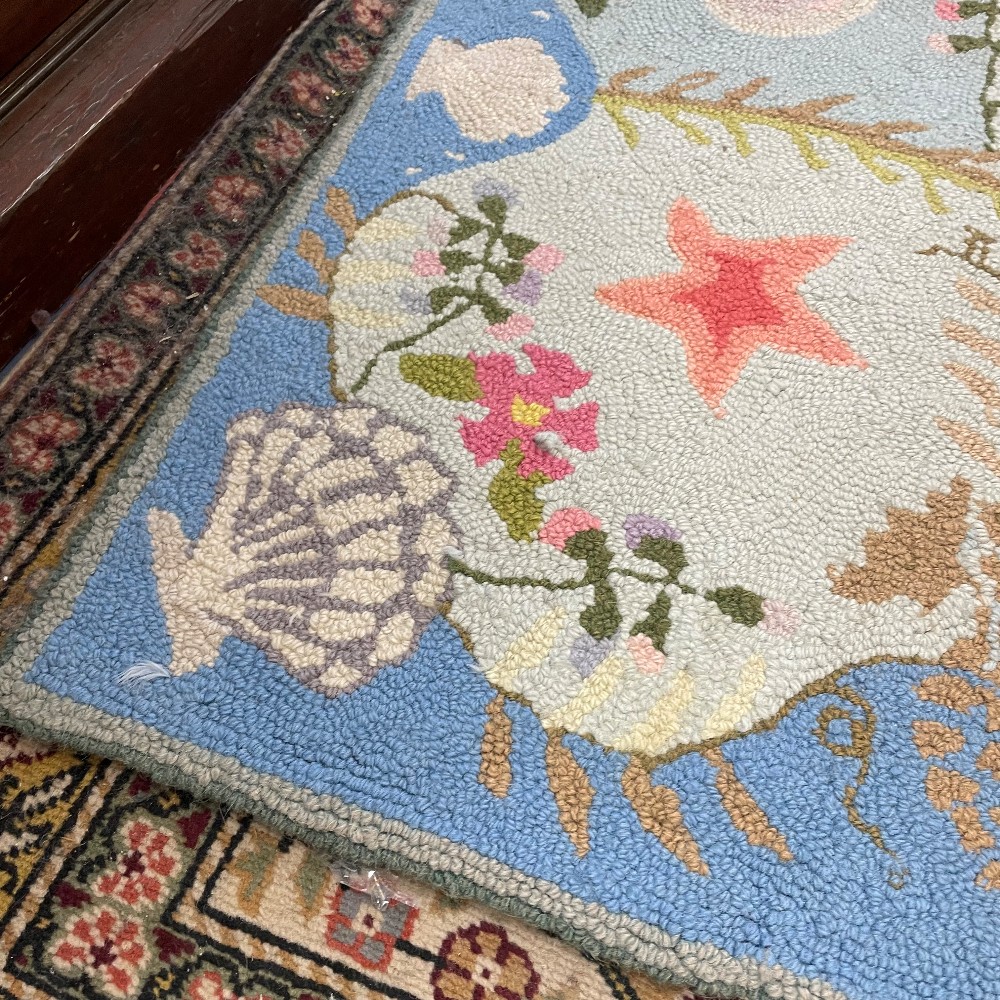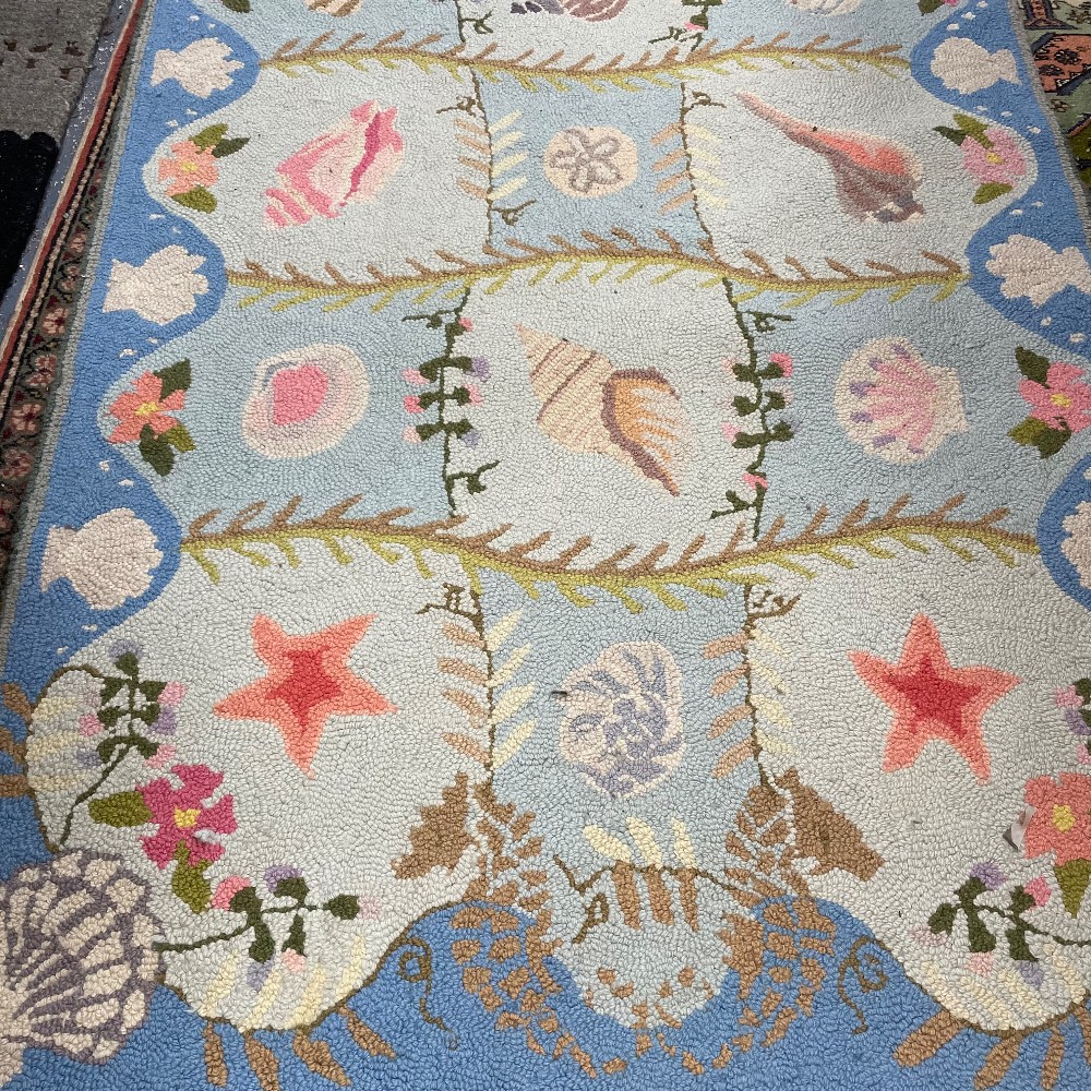 Soft blue, pink & green coastal shell motif. Measuring 61"L x 34"W
