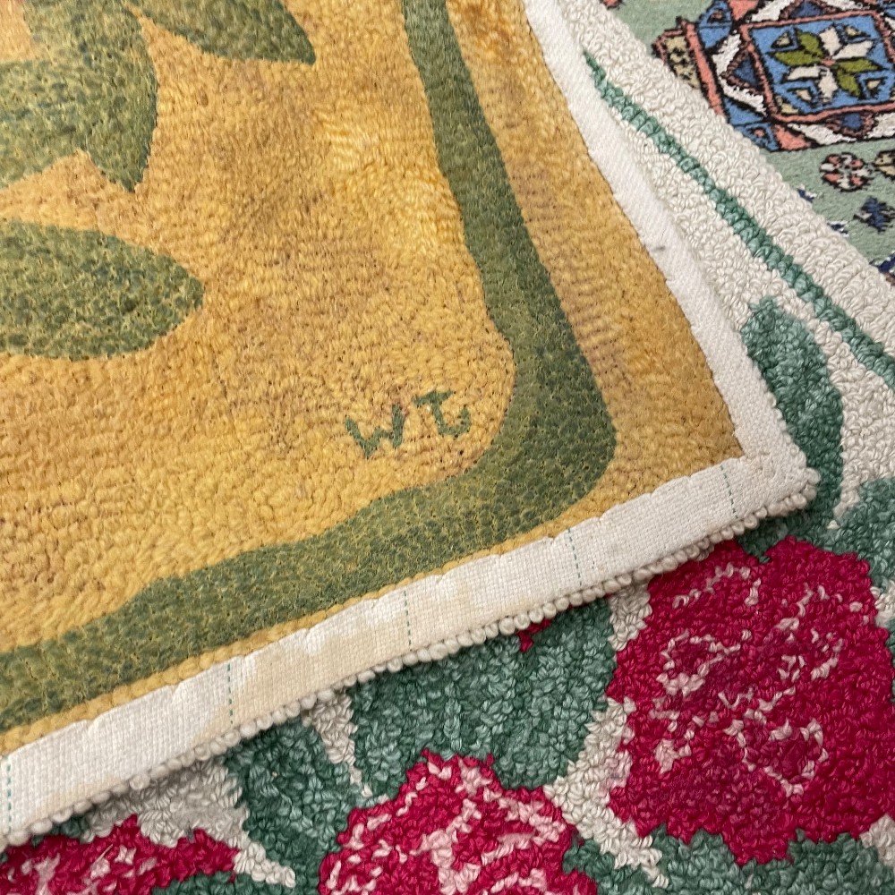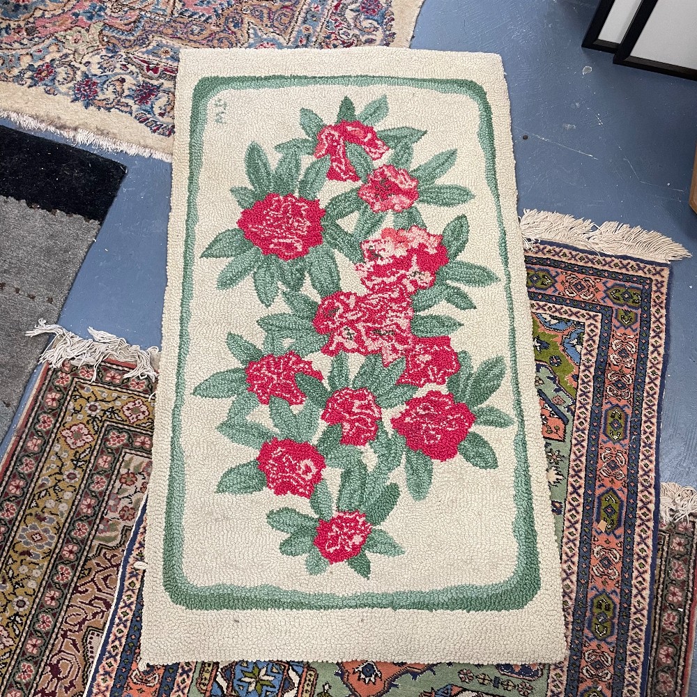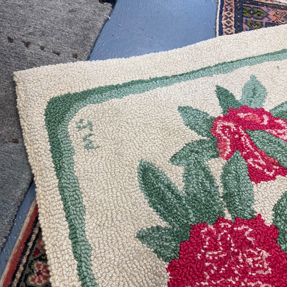 Cream background w/ dark pink/red flowers. Measuring 47"L x 26 1/2"W. Condition as pictured