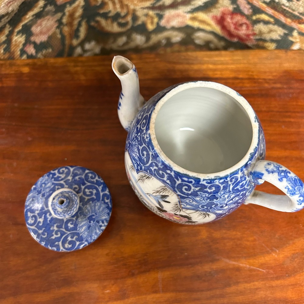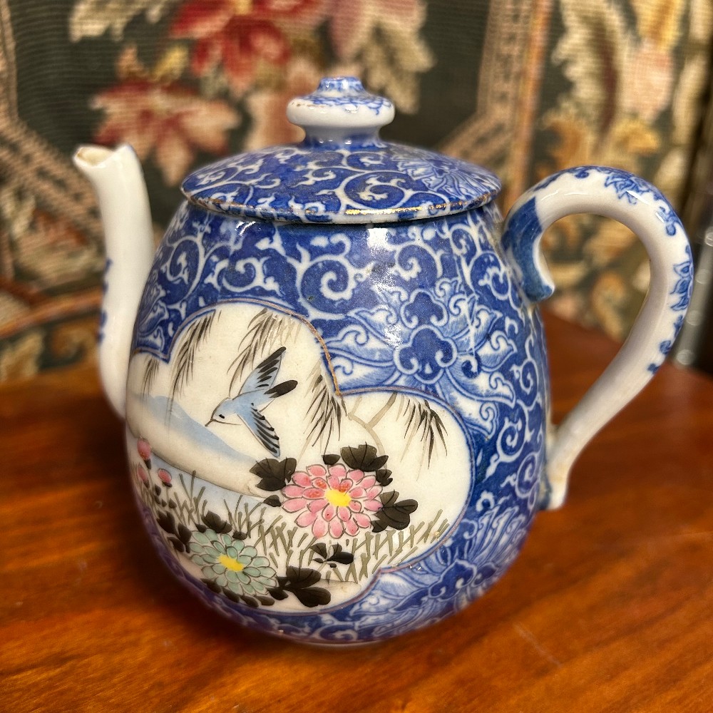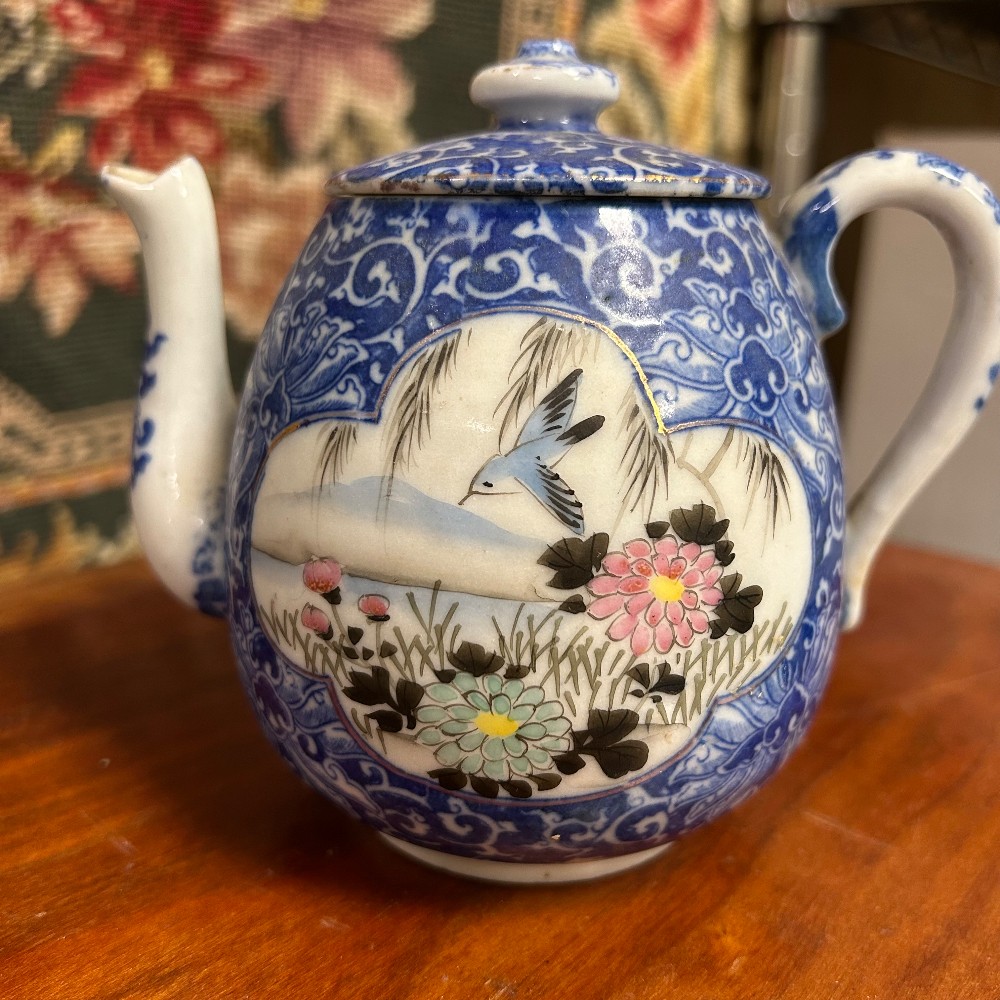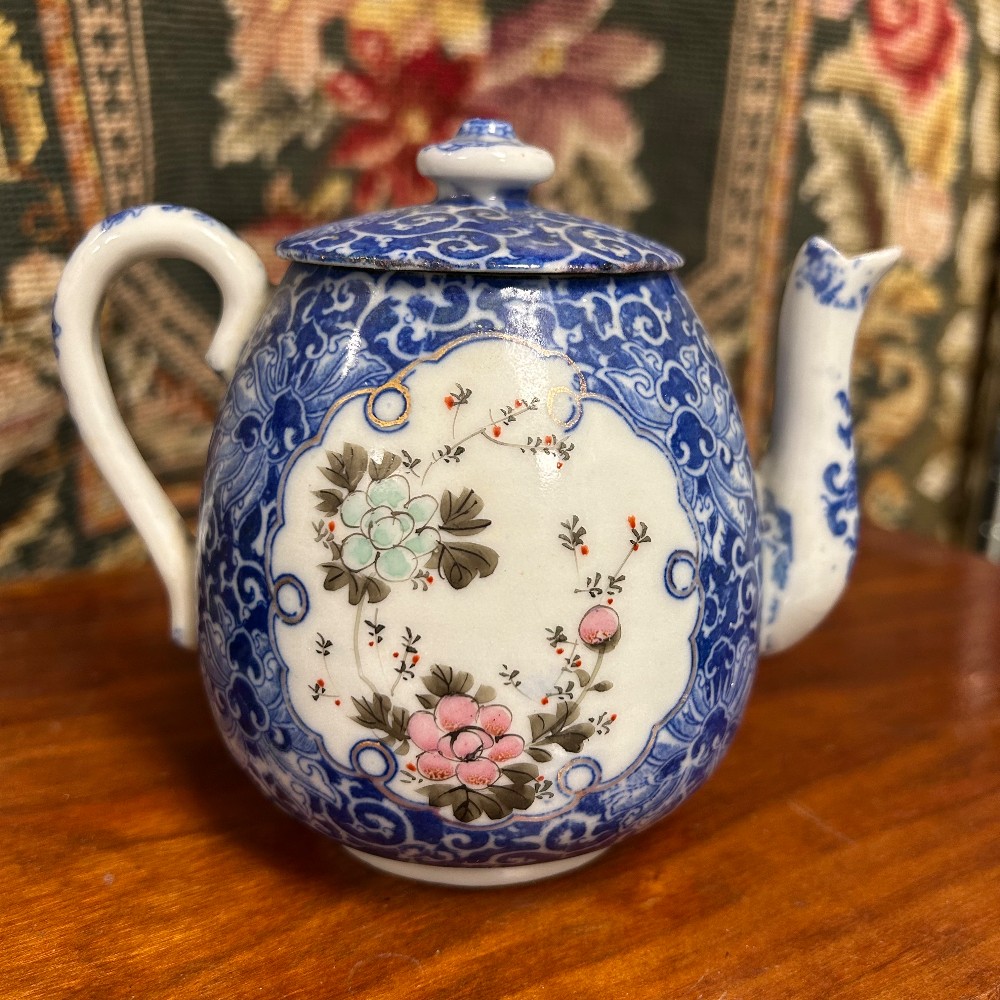 Blue & pink floral motif. Measuring approx. 4 1/2"T x 5"W x 3 1/2"W