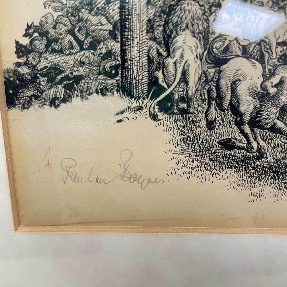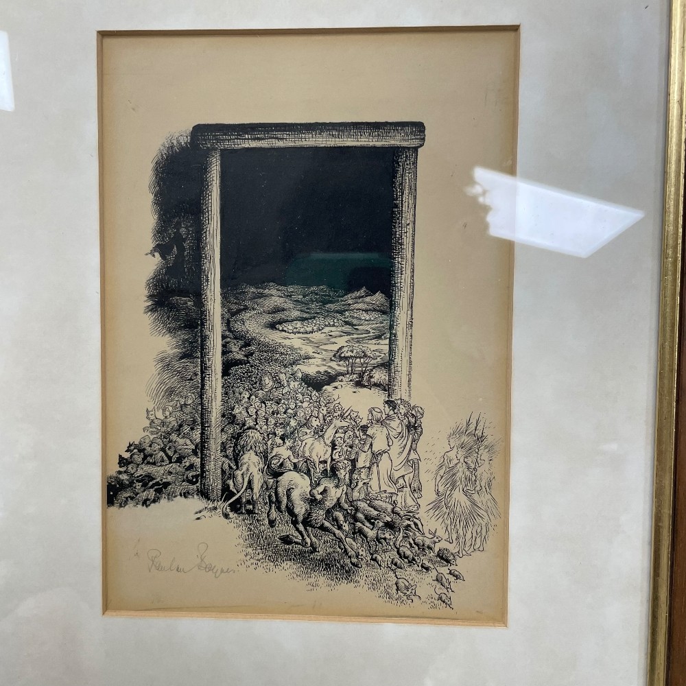 black ing drawing, framed, h. 13", w. 10"